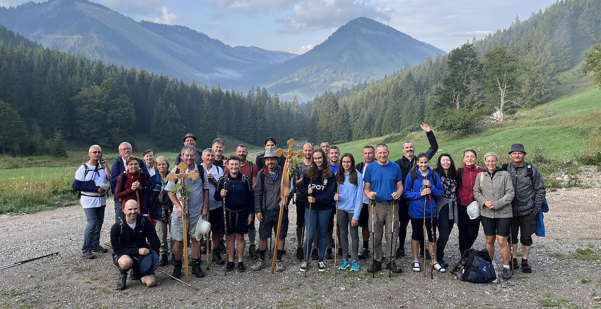 Wir feiern jeden Tag die heilige Messe: bei Aufbruch in Kópháza, am zweiten Tag in der Kapelle auf der Rosalia und am dritten Tag in der Hubertuskapelle in Vois. Unterwegs beten wir das Vaterunser, singen Marienlieder und haben auch Zeit für Gespräche und Regeneration.