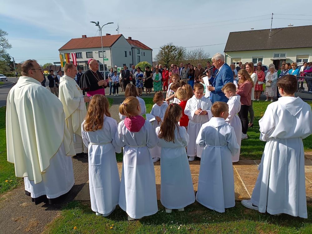 Bei herrlichem Wetter fand der Empfang des Bischofes Dr. Ägidius Zsifkovits im Freien statt. Die beiden Priester Mag. Kurt Aufner und Mag. David Grandits, Diakon Mag. Willi Jandrisits waren mit den vielen Gläubigen aus den einzelnen Pfarren des Seelsorgeraumes gekommen, um einen feierlichen Abschluss der dreitägige Visitation zu gestalten. Bürgermeister Mag. Thomas Novoszel und Gemeinderätin Prof. Mag. Nadine Graf hießen den hohen geistlichen Gast seitens der Gemeinde Neuberg willkommen. Aber auch die Kinder der örtlichen Volksschule mit dem Lehrerteam begrüßten Bischof Zsifkovits mit Gedichten und musikalisch mit dem „Neuberger Marienlied“ vor dem Marienmarterl. Gemeinsam setzte man dann neben dem Marterl einen Maulbeerbaum als Erinnerung an diesen Tag. Der Baum wurde von der Familie Ewald und Karin Konrad gespendet. Er soll auf der einen Seite eine historische Brücke in die Vergangenheit schlagen, standen doch einst Maulbeerbäume vor der Schule bzw. Kirche. Andererseits ist der Baum auch ein Symbol des Lebens, so wie der Auferstandene.