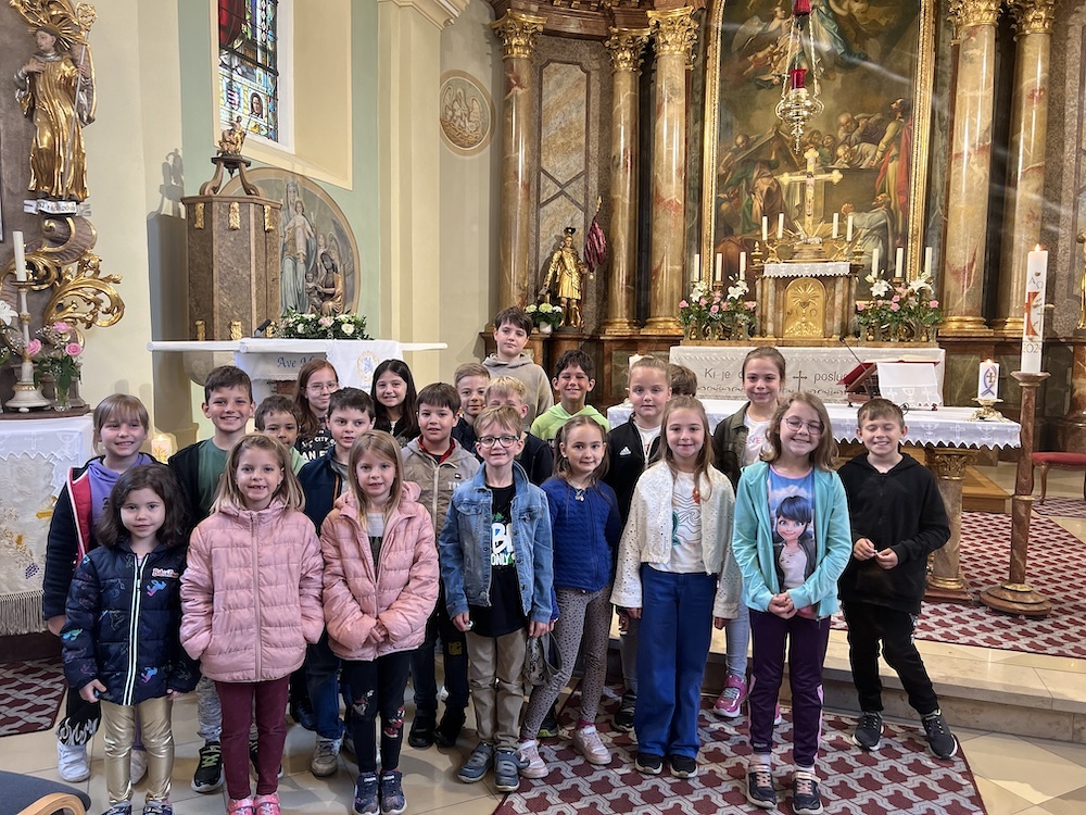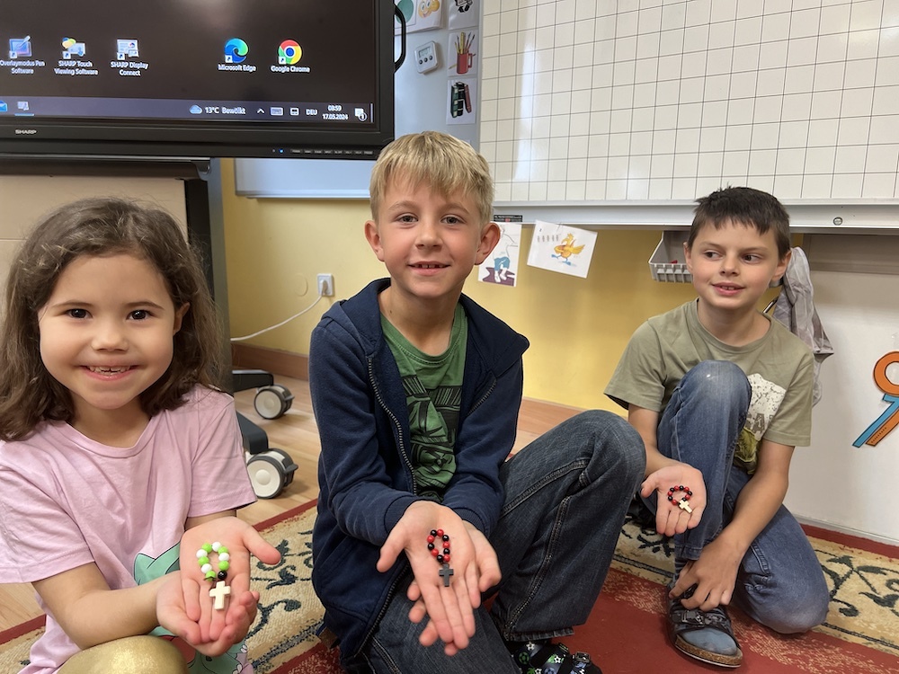 Sie ist dieses Jahr bei uns und wir Schulkinder haben ihr zu Ehren die Maiandacht mitgestaltet. Im Religionsunterricht haben wir mit großer Freude (kleine) Rosenkränze gemacht.