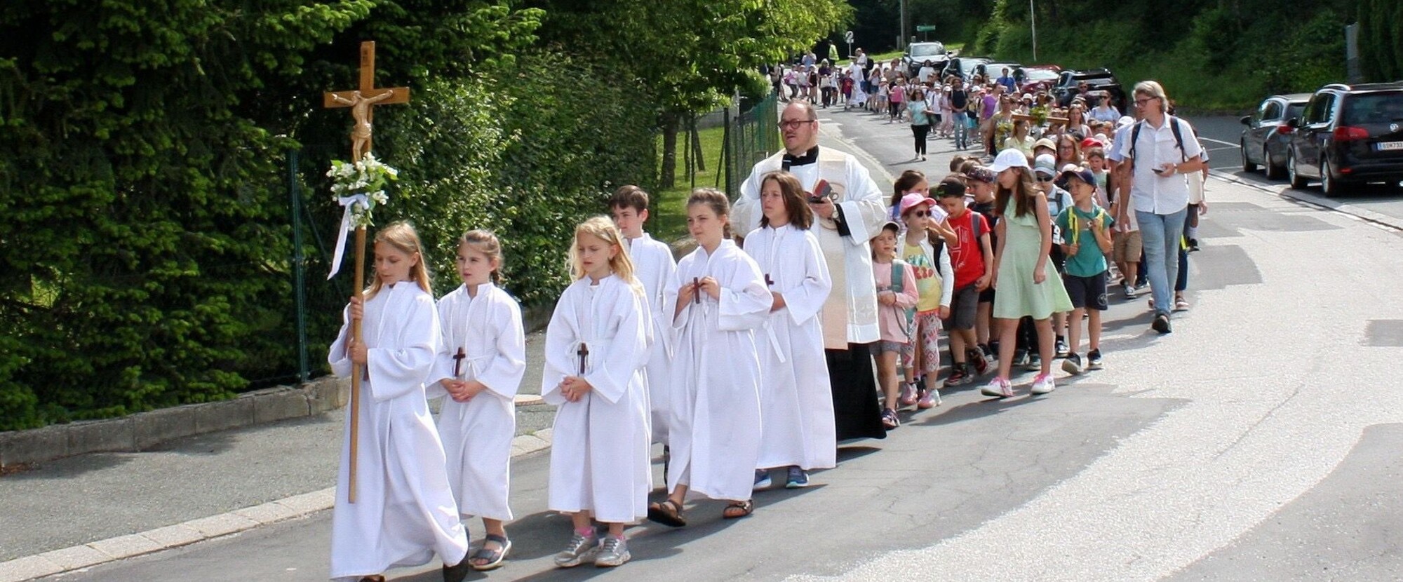 Kinder aus dem ganzen Burgenland kamen zur Schule in Güttenbach, wo sie von ihren Gastgebern erwartet wurden: Lehrerinnen und Lehrer sowie Kinder aus Güttenbach. Die ersten Grußwort sprach der Ortspfarrer, bevor um 10:00 Uhr die Prozession zur Kirche begann. Unterwegs beteten und sangen alle unter der Leitung des örtlichen Pfarrers. Die meisten Schulen reisten mit dem Bus zur Wallfahrt an, doch die Kinder aus Neuberg machten sich zu Fuß auf den Weg. Die heilige Messe zelebrierte der Ortspfarrer David Grandits, in Konzelebration mit kroatischen Priestern aus dem Burgenland. Die Kirche von Güttenbach war bis zum Rand gefüllt.
