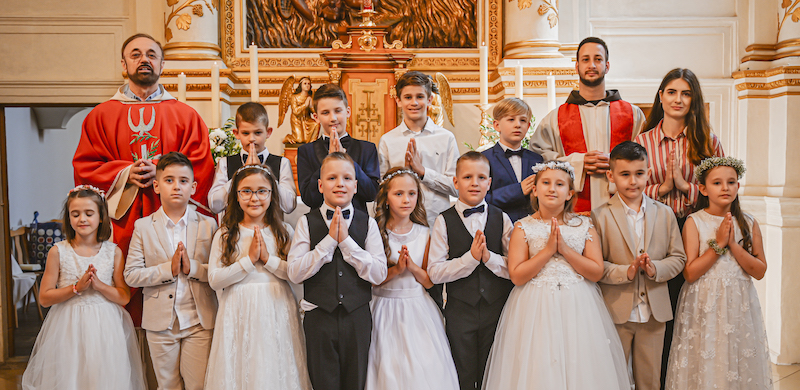 Am Pfingsttag war es in der „Kroatische Mission von Eisenstadt“ besonders feierlich: 13 Kinder, die sich fleißig und geduldig auf die Sakramente der hl. Beichte und der hl. Kommunion vorbereitet hatten, empfingen ihre erste hl. Kommunion. Begleitet vom Pfarrer P. Božidar Blažević OFM, Kaplan Pater Stjepan Lukašević, Religionslehrerin Martina Mihaljević und den Ministranten betraten die Erstkommunionkinder feierlich die Franziskanerkirche.