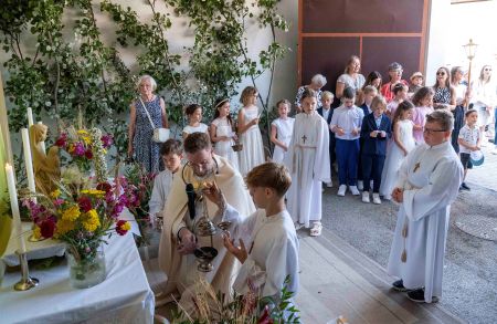 Zu Fronleichnam, am Hochfest des Leibes und Blutes Christi, wurde die hl. Messe in Wulkaprodersdorf um 10.00 Uhr gefeiert. Die Kirche war voll von Gläubigen, den Feuerwehrleuten und Musikern, die nach der hl. Messe musikalisch die Prozession durch die Gemeinde gestaltet haben. Vier Altäre waren vorbereitet und warteten auf die ausgesetzte Monstranz. Die Erstkommunionkinder haben beim ersten Altar ein Lied für Jesus Christus gesungen und sich damit bedank für das Geschenk, das er ihnen gemacht hat.