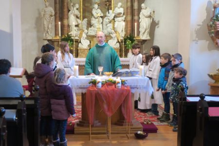 Pfarrer Mag. Lic. Grzegorz Kotynia zelebrierte die Hl. Messe. Am Ende des Gottesdienstes erteilte er den Blasiussegen. Im Anschluss daran luden die Eltern der Erstkommunionkinder zu einer Agape und zu einem gemütlichen Beisammensein in das Dorftreff ein.