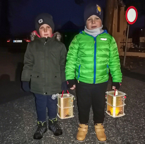 Aus diesem Anlass kamen Fin Eberhardt und Maximilian Zach mit ihren Laternen zur heiligen Messe und brachten festlichen Lichterglanz in die Messe, worüber sich alle TeilnehmerInnen freuten.