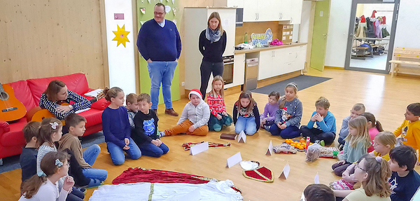 Danach wurde auch von Lehrerin Roswitha Staudinger mit den Kindern gemeinsam zu diesem Thema gearbeitet, vor allem auch auf kroatisch. Man besprach unter anderem Kleidung des heiligen Nikolaus, die dann auch Schritt für Schritt angelegt wurde, so dass am Ende die Lehrerin als Nikolaus gekleidet vor den Kindern stand. Gemeinsam füllten die Kinder die Gabensäckchen, die sie am Ende des Tages mit nach Hause nehmen durften. Auch gesungen wurde zu Ehren des heiligen Nikolaus, ehe man gemeinsam eine Nikolausjause einnahm.