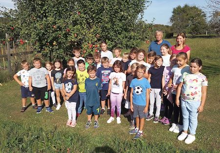 Priroda je tako raznolika i najbolja inspiracija, ar dici nudi širok izbor mogućnosti za igru i učenje, ke zadovoljavaju dičinju potribnost za otkrivanje. Ovde se najdu mnogi poticaji, ki razvijaju kreativnost. U sklopu edukativne ekskurzije pohodila su dica obitelj Silvije i Karla Kührera, ki imaju seosku trgovinu. Dica su sada mogla sama brati jabuke na vrtu. Obradjivana su različna ćutila dice, ar su tokom aktivnosti mogla premišljavati, otkrivati, ćutiti, dušati, kušati i naravno gibati stvari. Čim već ćutil se prilikom učenja aktivira, tim već si dica zapamtu. Drugi cilj je bio, razviti svist o održivosti i regionalnosti. Od ovih jabukov, ke su dica sama nabrala, kot i onih, ke su dali roditelji, će se sada prešiti jabukov sok na bio-seljačkom dvoru Biance i Marcela Pompera. Napunjen u floše i ukrašen etiketami, ke su napravila dica, ov sok će biti pred- stavljen stanovnikom Nove Gore pri žetvenoj zahvali 1. oktobra 2023. Na kraju posebno hvala obitelji Kührer, ka je po branju jabukov dici priredila južinu s jilom i jabukovim sokom.