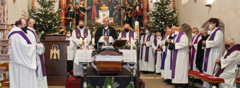 Pokojni farnik pokopan je uz crikvu uz prethodnike Jožefa Strassnera, Vincija Karlovića.
