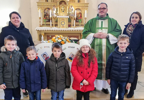 Na sliki su od liva na desno: David Kulović, Mihael Knor, Tobijas Andrä, Izabela Aspan, Paul Dergović a za njimi vjeroučiteljica Nicole Horvatić, farnik mag. David Grandić i učiteljica Rozvita Staudinger.