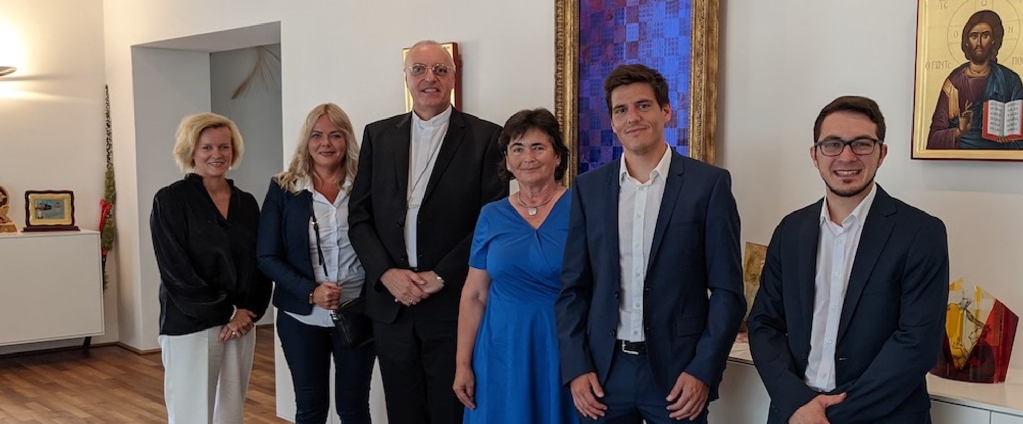 Na sliki su od liva na desno: nadzornica za hrvatski vjeronauk na obavezni škola Katja Marth, od oktobra dezignirana nadzornica za sjeverno područje Tatjana Steurer-Kiss, biškup dr. Egidije Živković, ravnateljica Školskoga ureda dv. savj. mag. Andrea Berger-Gruber, nadzornik za više škole dr. Lukas Pallitsch, ter od oktobra dezignirani nadzornik za sredinu i jug Matthias Weber. Na sliki nije sadašnja nadzornica za vjeronauk na obavezni škola za cijelo Gradišće mag. Renate Heller.