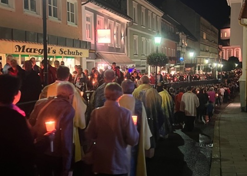 Vrhunac shodišća je i ljetos bila sveta maša u 19.00 ura kod glavnoga oltara, ku je predvodio mmag. Franjo Borenić a oblikovala fara Pandrof - tamburica “Ivan Vuković”, kantor Štefan Keczöl -, kade je od prošloga ljeta bivala Putujuća Marija Celjanska. Koncelebriralo je 14 svećenikov. Na početku sv. maše je jako curilo i vjerniki su bili razočarani, da neće biti procesije. Ali Majka Božja nam je pomogla i po sv. maši se je razvedrilo ter je bilo moguće držati ganutljivi ophod sa svićami vani po varošu. Predvodio ga je biškupski vikar kan. duh. savj. mag. Željko Odobašić. U baziliki je lipe marijanske jačke pjevala grupa muži s kantorom Štefanom Bubićem, ki je med tim kratkimi molitvami i meditacijami nadahnuo misli hodočasnikov.