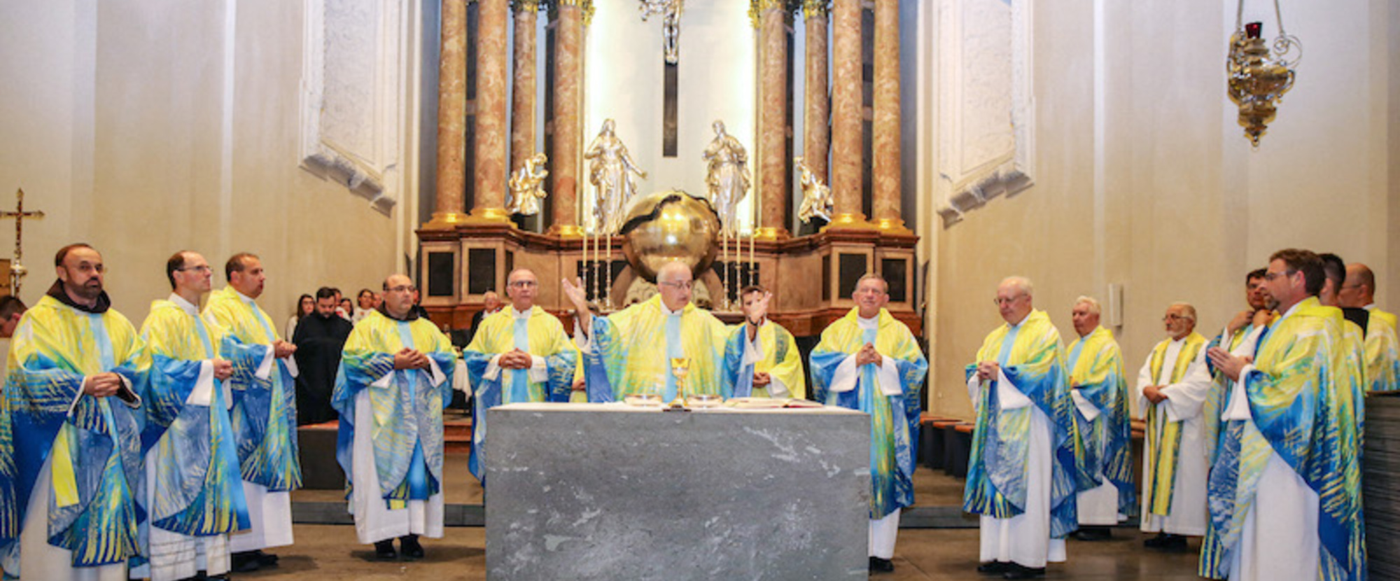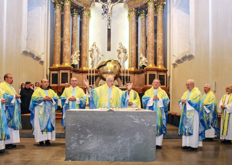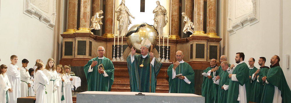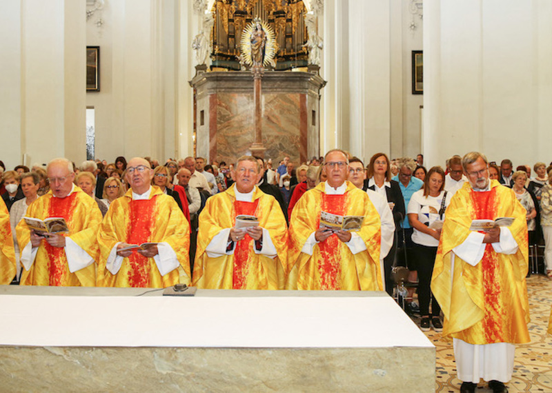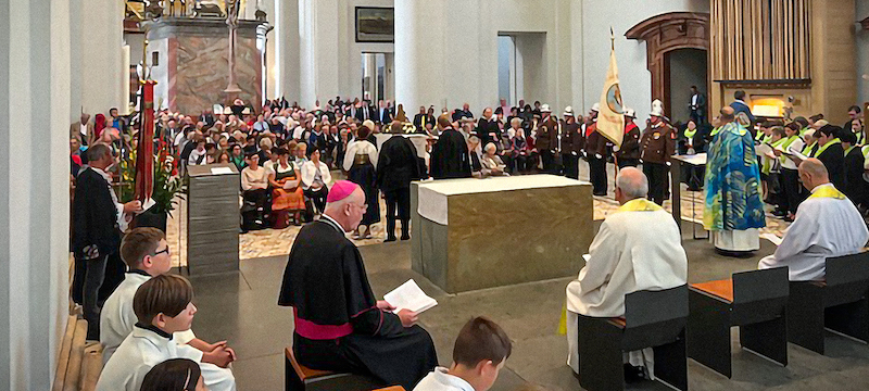 Vrhunac je bila kot svako ljeto u 10.00 ura svetačna sveta maša kod glavnoga oltara, ku je predvodio biškup mons. mag. dr. Egidije Živković u krugu brojnih svećenikov a oblikovala fara Kalištrof/Bajngrob - mišani crikveni zbor Kalištrof/Bajngrob, kantor mag. Jožef Gsertz.