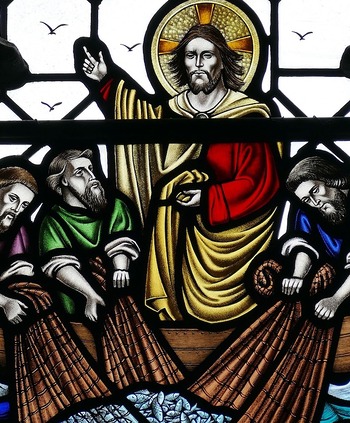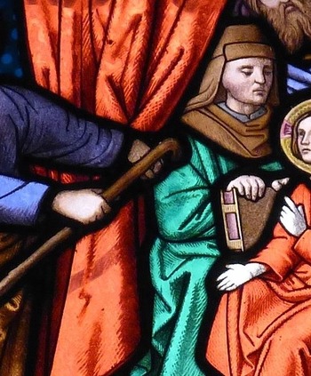Kirchenfenster mit einer Darstellung der Heiligen Familie in der Kirche Sankt Rochus in Bonn am 12. Juli 2021. Maria hat den Kopf gesenkt, Josef steht an der Werkbank und Jesus hält ein Kreuz in den Händen.