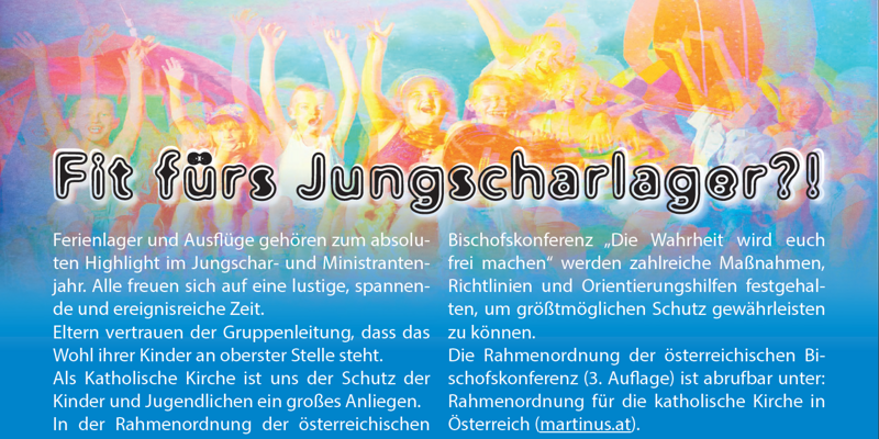 Ferienlager und Ausflüge gehören zum absoluten Highlight im Jungschar- und Ministrantenjahr. Alle freuen sich auf eine lustige, spannende und ereignisreiche Zeit. Eltern vertrauen der Gruppenleitung, dass das Wohl ihrer Kinder an oberster Stelle steht.