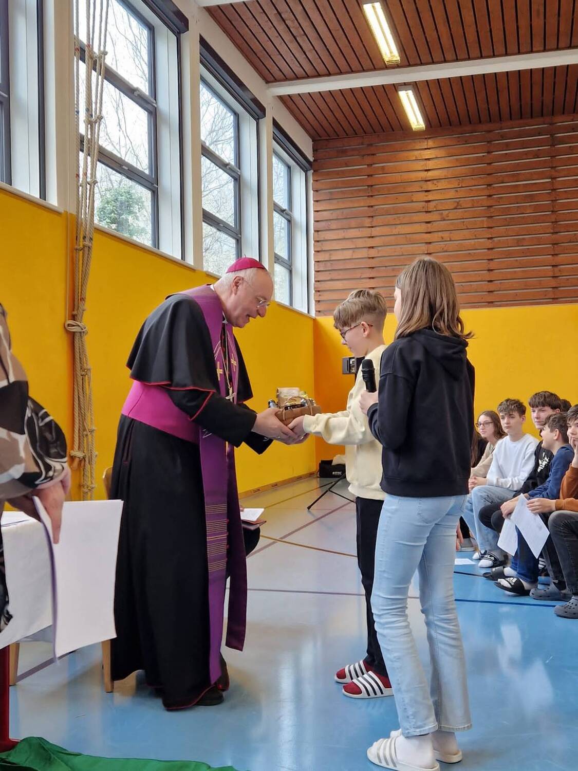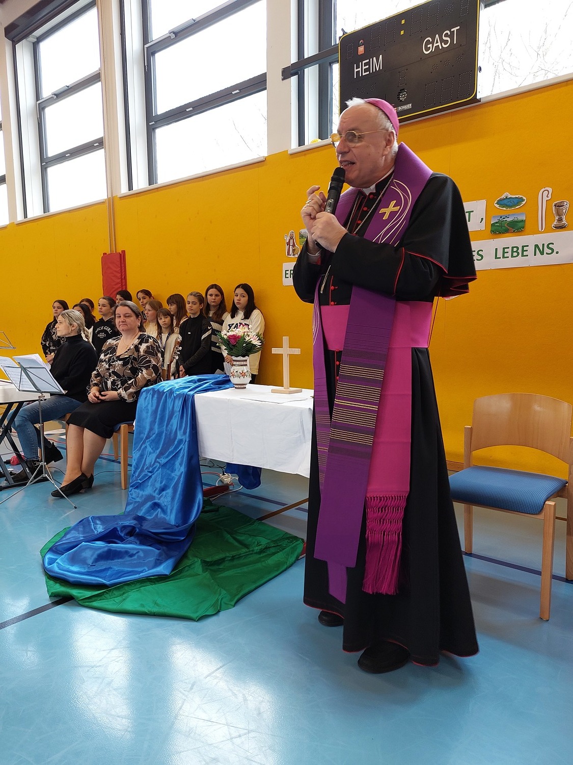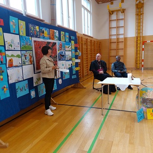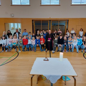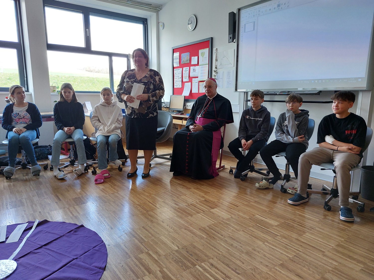 Weiter ging der Vormittag an der Mittelschule Kobersdorf. "Der Herr ist mein Hirte" war hier der Leitsatz der ökumenischen Wort-Gottes-Feier, an der auch Kinder und Lehrpersonen der örtlichen Volksschule und Pfarrmoderator Shinto Varghese Michael teilnahmen. Im folgenden Besuch in der ersten und zweiten Klasse wurde gerappt, ein Kahoot-Quiz gespielt und der Osterfestkreis als Bodenbild gelegt. Es blieben auch ein paar Minuten Zeit, um mit dem Herrn Bischof ungezwungen zu plaudern - sowohl für die Schüler*innen als auch für das Lehrpersonal. Herzlichen Dank an dieser Stelle an Kolllegin Doris Horvath, die evanglische Religionslehrerin Martina Köppel und Direktorin Carina Werba für ihr Engagagement in der Gestaltung des abwechslungsreichen Vormittags.