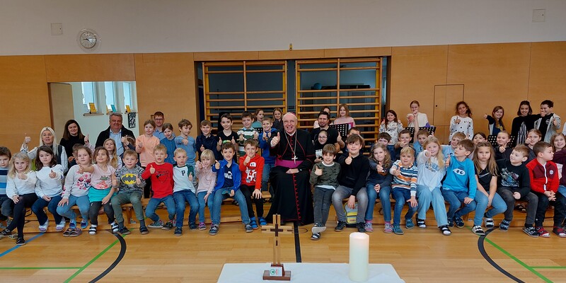 In den burgenländischen Landessprachen begrüßten Kinder der Volksschule Neckenmarkt Bischof Ägidius Zsikovics an der Schultür zur ersten bischöflichen Schulvisitation 2024. Es folgte ein lebendiger Wortgottesdienst im Turnsaal unter dem Motto "Was uns wertvoll ist", der durch zahlreiche Schüler*innen mitgestaltet wurde. Bischof Ägidius gab in seiner Ansprache den Kindern drei Wörter von Papst Franziskus mit, die im Gespräch noch genauer erläutert wurden: "Bitte", "Danke" und "Entschuldigung". Kinder aller Klassen erzählten danach über zahlreiche Aktivitäten, die an der Schule im Rahmen des Religionsunterrichts geschehen. Neben den Schüler*innen und dem Kollegium nahmen auch Kreisdechant und Ortspfarrer Nicolas Abazie, sowie Bürgermeister Johannes Igler am Visitationsbesuch teil. Ein besonderer Dank an den herzlichen Empfang und die gelungene Vorbereitung geht an Religionslehrerin Christine Loibl und Direktorin Christine Heinrich.