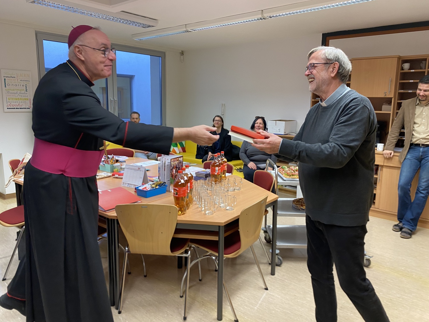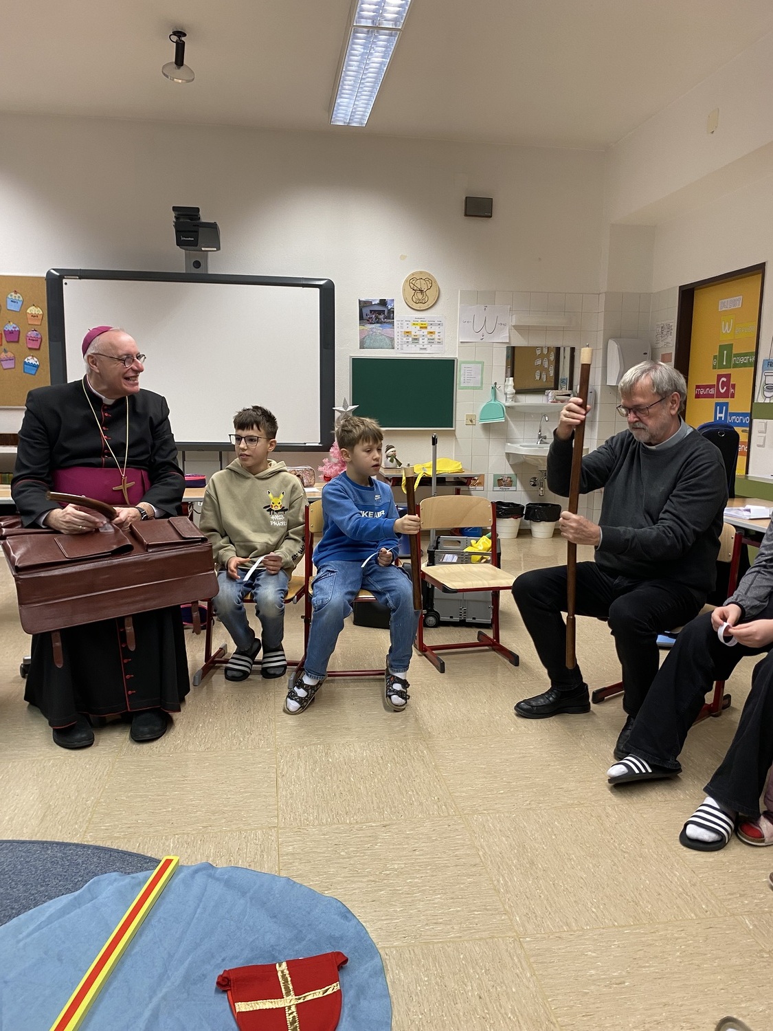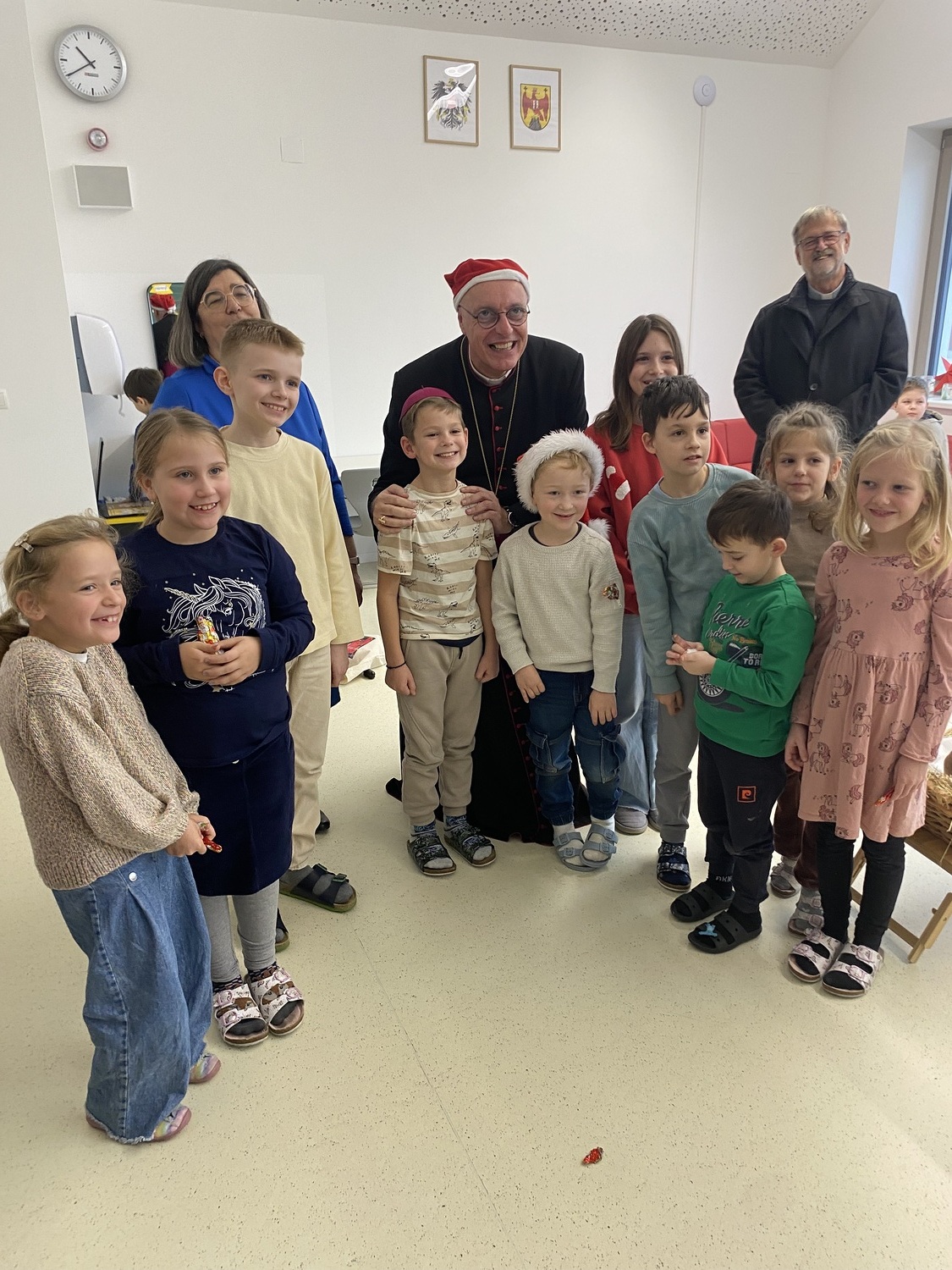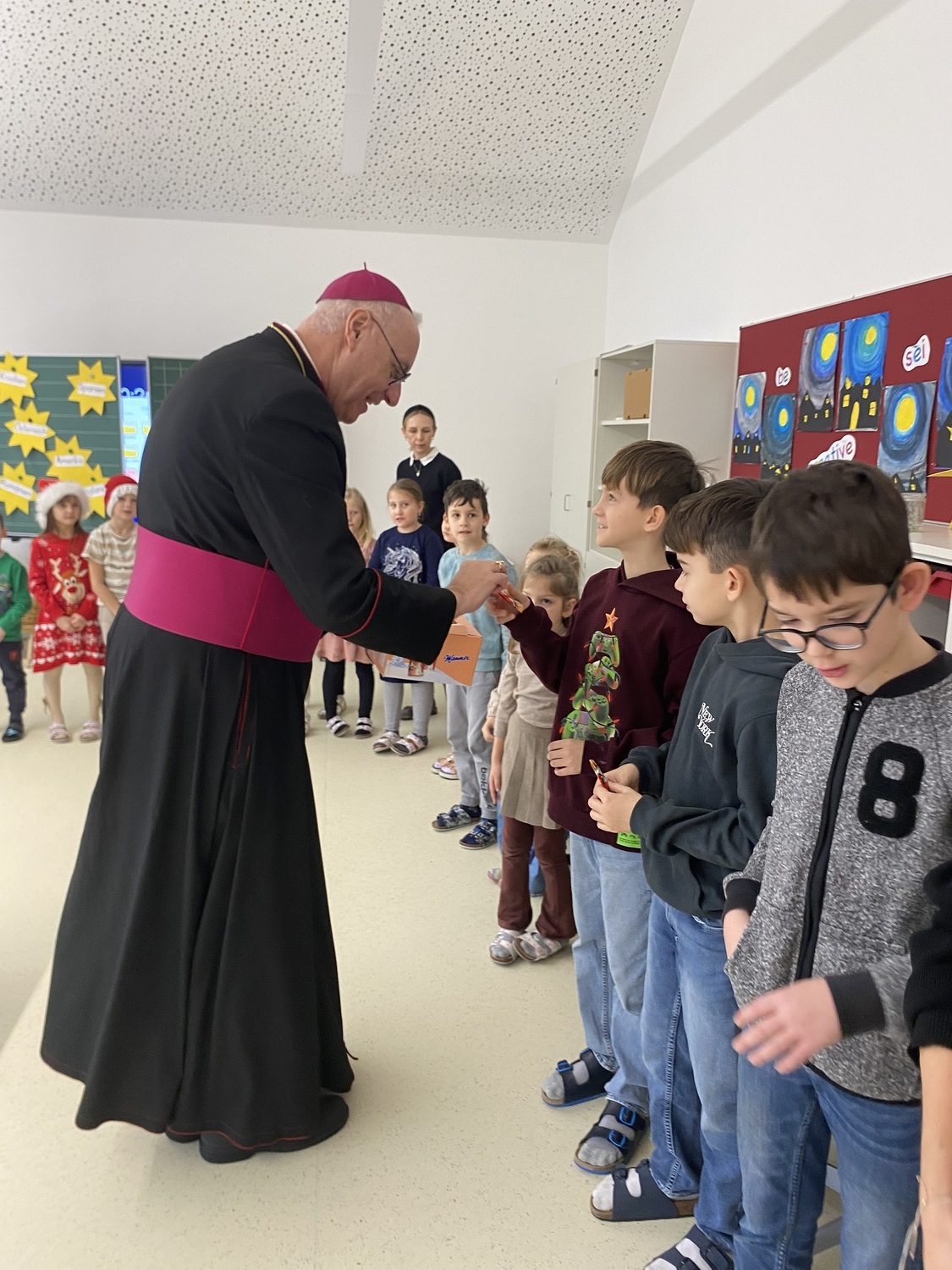 Nach einer stimmungsvollen gemeinsamen Adventandacht im Turnsaal, die von Religionslehrerin Maria Wiesinger zum Thema „Licht im Advent“ gestaltet wurde, nahm sich der Herr Bischof Zeit für den Besuch von drei Klassen. Die mitgebrachte Mitra und der besondere Bischofsstab des Herrn Diözesanbischofs weckten großes Interesse bei den neugierigen Schüler:innen. Besonders beeindruckt zeigte sich der Herr Bischof von einer Mehrstufenklasse, in der Schülerinnen und Schüler aller vier Schulstufen engagiert Fragen stellten und miteinander ins Gespräch kamen. Ein kulinarisches Beisammensein mit dem Kollegium bot anschließend Gelegenheit zum persönlichen Austausch.