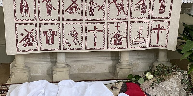 Josef kaufte ein Leinentuch, nahm Jesus vom Kreuz, wickelte ihn in das Tuch und legte ihn in ein Grab, das in einen Felsen gehauen war. Dann wälzte er einen Stein vor den Eingang des Grabes.