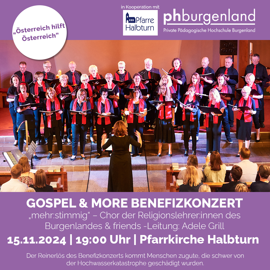 Die PPH Burgenland agiert solidarisch und engagiert sich: "mehr:stimmig", der Chor der Religionslehrer:innen des Burgenlandes & friends, organisiert im Rahmen des Fortbildungsangebotes des Instituts für Religionspädagogik und transformative Bildung der PPH Burgenland ein Benefizkonzert in der Pfarrkirche Halbturn. Das Benefizkonzert „Carried Me with You“ findet am 15. November 2024 um 19:00 Uhr statt. Wir laden Sie herzlich ein!