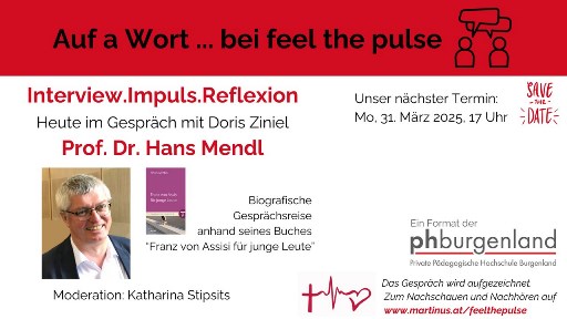 Das neue feel the pulse-Format "auf a Wort" ist erfolgreich gestartet. Der bekannte Religionspädagoge Prof. Dr. Hans Mendl sprach mit Doris Ziniel anhand seines Buch "Franz von Assisi für junge Leute" über persönliche Erlebnisse und Erfahrungen. Das Buch ist in 24 prägnante und leicht lesbare Kapitel eingeteilt, in denen Mendl Texte und biografische Lebensabschnitte des Hl. Franziskus mit unserer Lebenswelt in Kontext bringt.