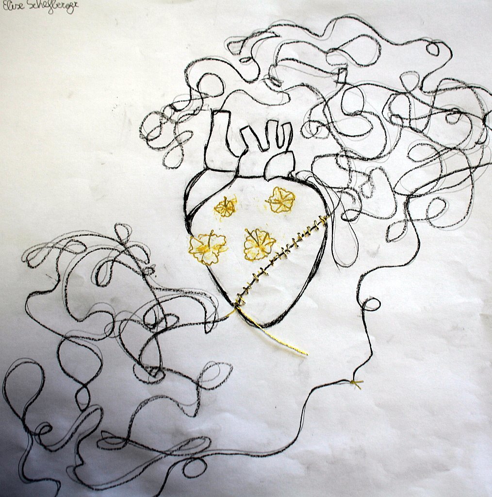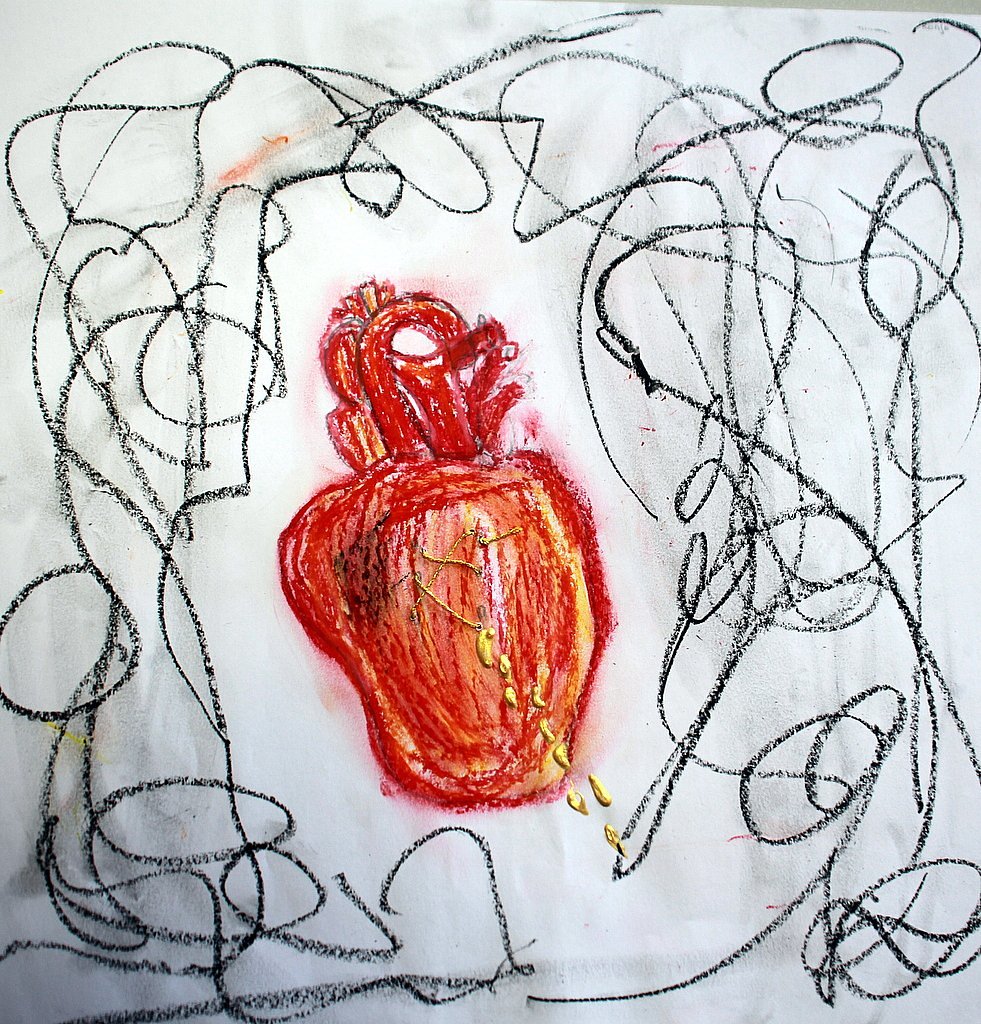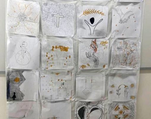 In den Hungertüchern, die die Schülerinnen und jeder Schüler malen, und bringen neben Verletzungen und Krisen auch Wandlungsmomente durch verschiedene Hoffnungssymbole zum Ausdruck.