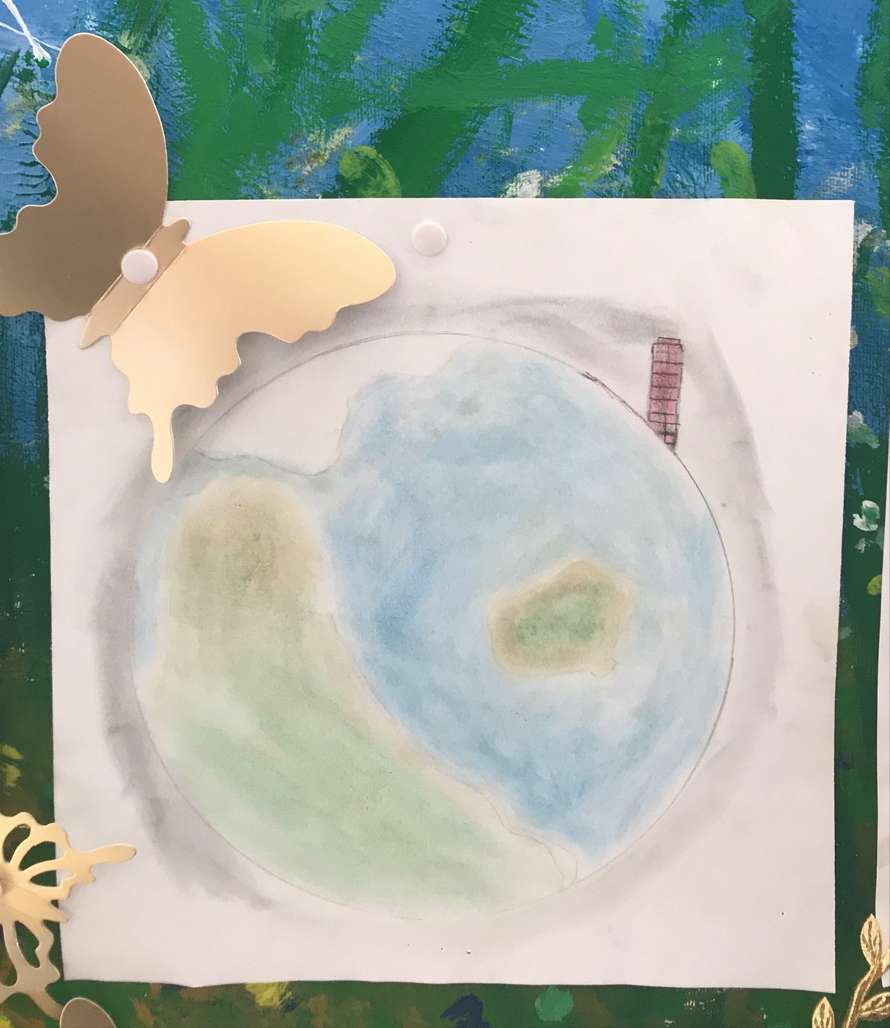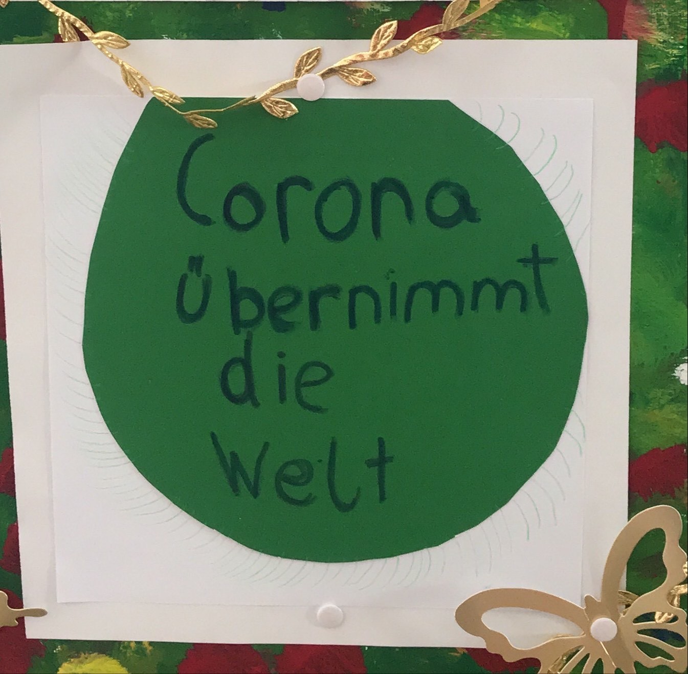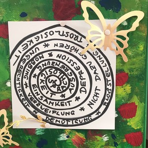 Die verschiedenen Interpretationen und Wahrnehmungen finden sich in Bildern und Worten auf einem großen Bild einer Blumenwiese wieder und werden durch einen goldenen Blütenfaden verbunden – goldene Schmetterlinge sind Zeichen für die Hoffnung auf WANDEL.