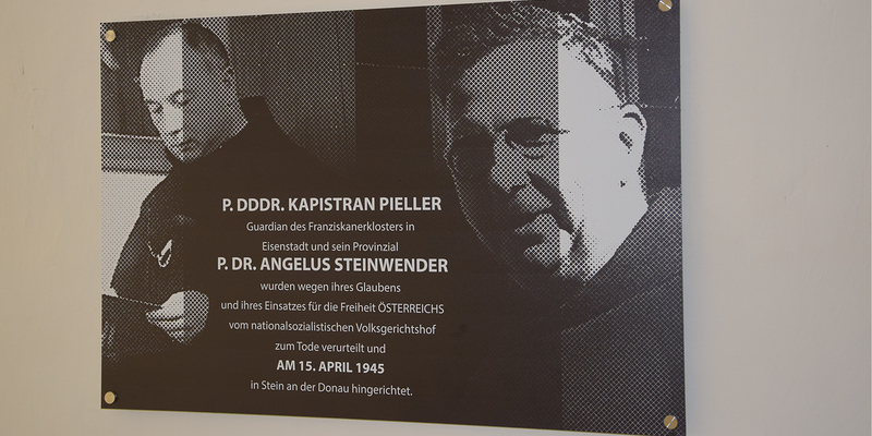 Eisenstadt – Neben dem Eingang der ehemaligen Franziskanerkirche, jetzt Rektoratskirche St. Michael, hängt seit fast einem Jahr eine Gedenktafel. Gewidmet ist sie den Widerstandsgeistlichen Pater Johann Kapistran Pieller, der an diesem Ort seine letzte Wirkstätte hatte, und seinem Provinzial Pater Angelus Steinwender. Anlässlich des 75. Hinrichtungstages am 15. April vergangenen Jahres wurde sie angebracht, gestaltet hat sie Künstler Heinz Ebner. Einblick in das Leben und Schaffen Pater Kapistran Piellers sowie anderer bedeutender Persönlichkeiten, Exponate historisch prägender Momente und zeitgenössische Kunst erwarten die Besucher der Ausstellung "Pannonische Geschichte(n). 60 Jahre Diözese Eisenstadt – 100 Jahre Land Burgenland" im Diözesanmuseum, dessen Eingang sich nur wenige Meter daneben befindet.