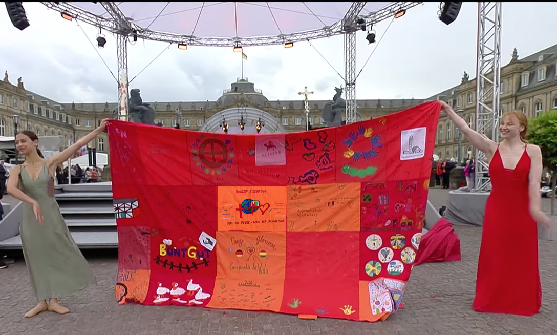 Ein Tänzer befestigte den Mantel eindrucksvoll via Vertikaltuchakrobatik an einer Stange hinter dem Altar, unten reichte der Mantel bis zur Bühne vor dem Neuen Schloss. Die einzelnen Stücke wurden nach dem Motto des Katholikentags „Leben teilen“ von verschiedenen Gruppen gestaltet.