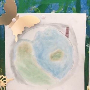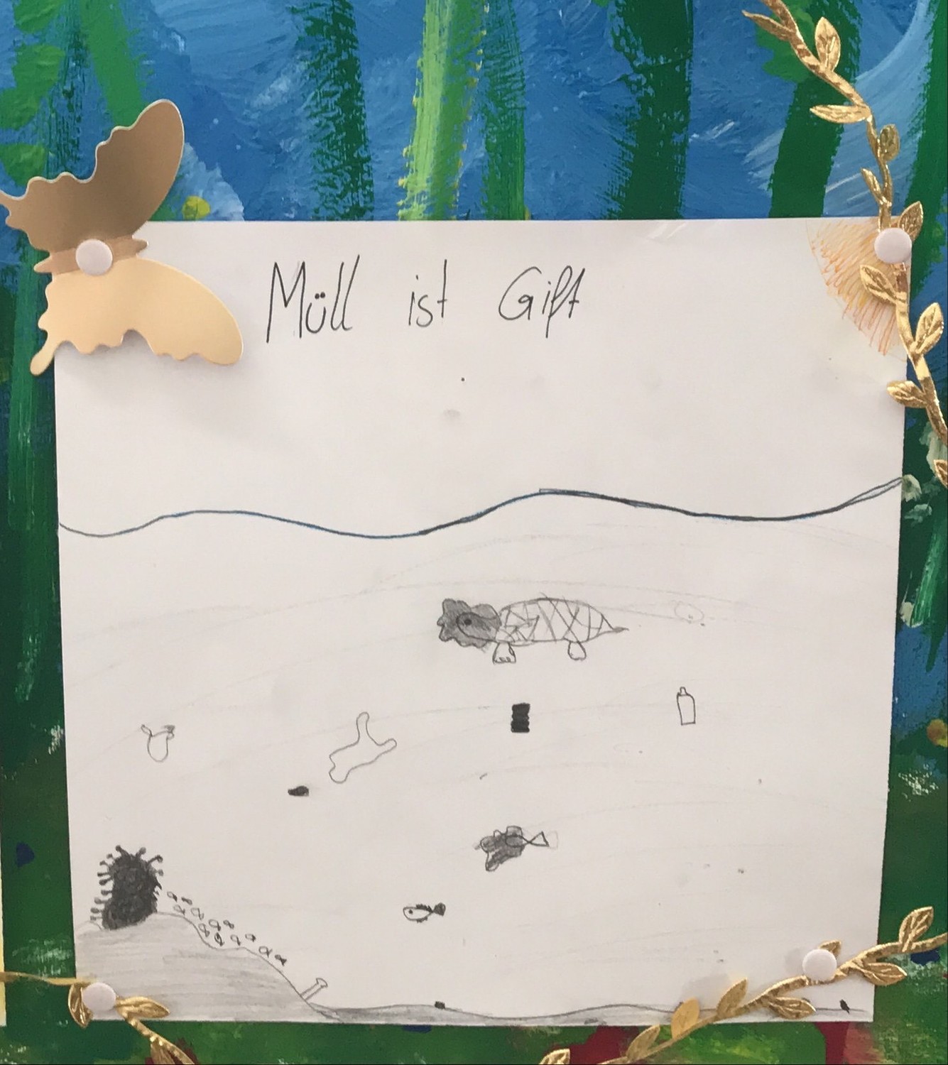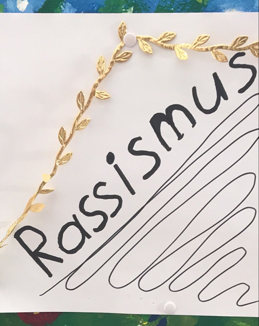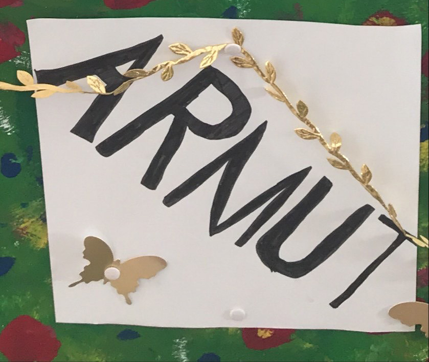 Die verschiedenen Interpretationen und Wahrnehmungen finden sich in Bildern und Worten auf einem großen Bild einer Blumenwiese wieder und werden durch einen goldenen Blütenfaden verbunden – goldene Schmetterlinge sind Zeichen für die Hoffnung auf WANDEL.