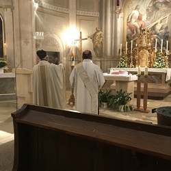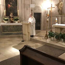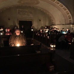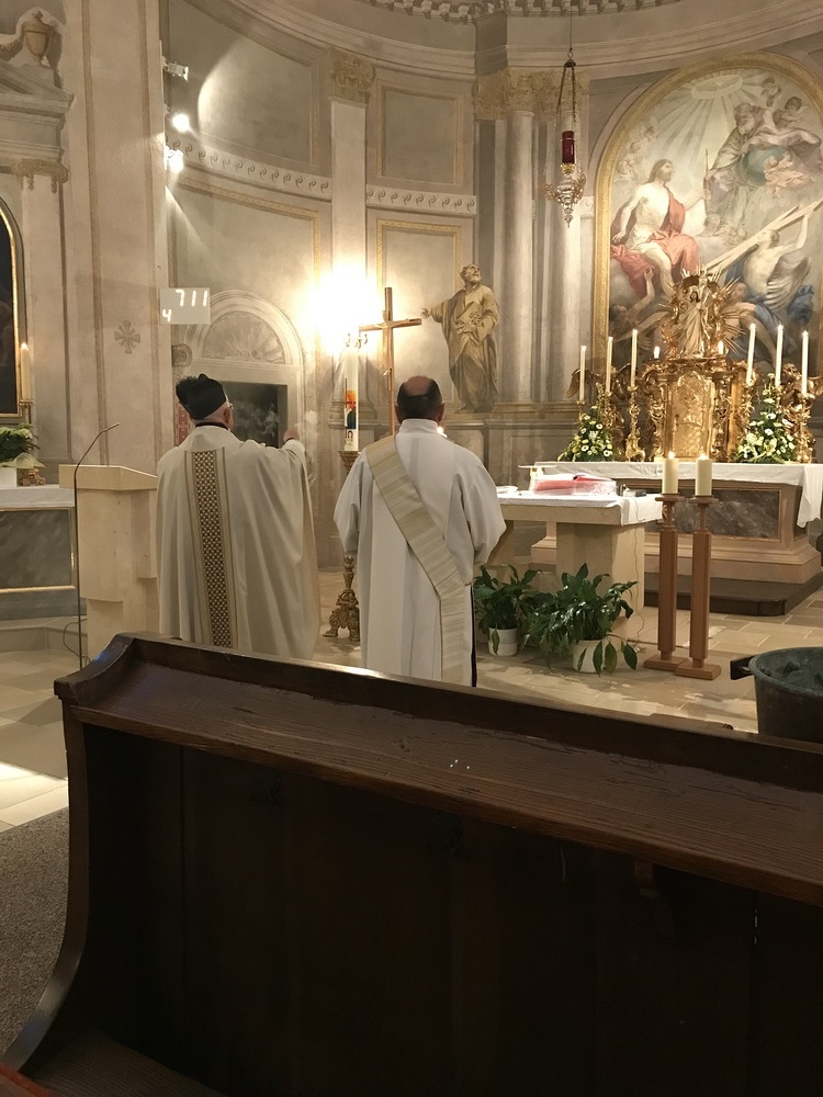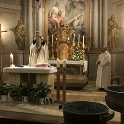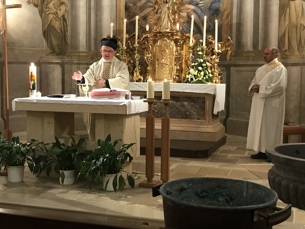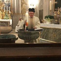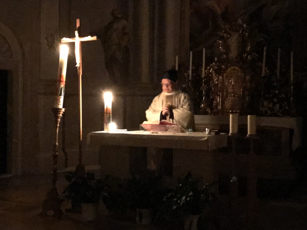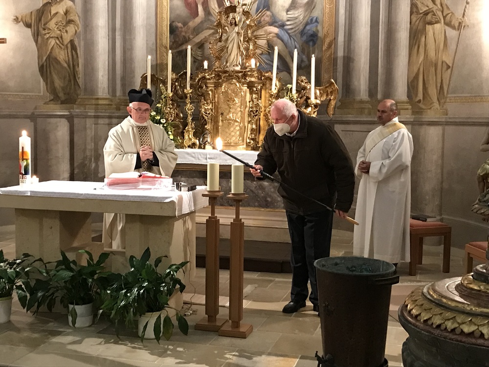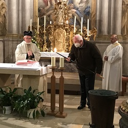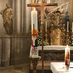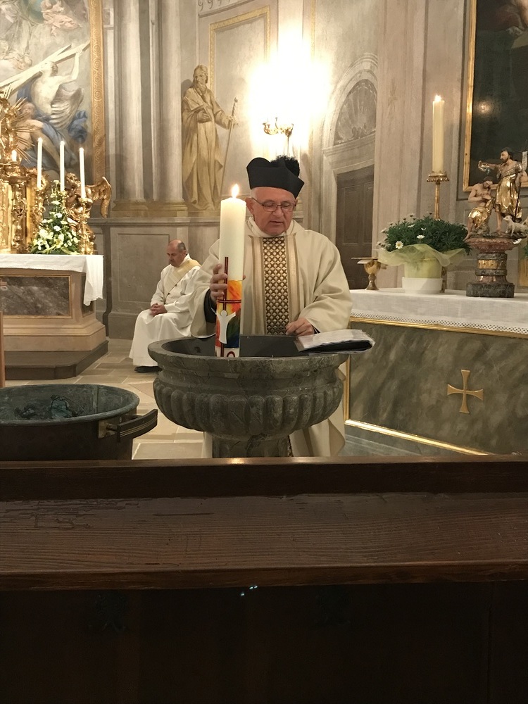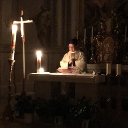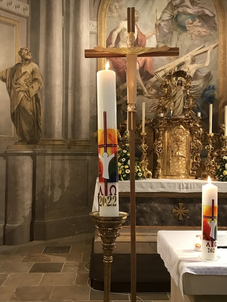 Nach der Lichtfeier, der Segnung des Osterfeuers, im Pfarrhofgarten zogen wir in die Stadtpfarrkirche, wo die Messfeier, beginnend mit dem großen Exsultet (Osterlob) fortgesetzt wurde.