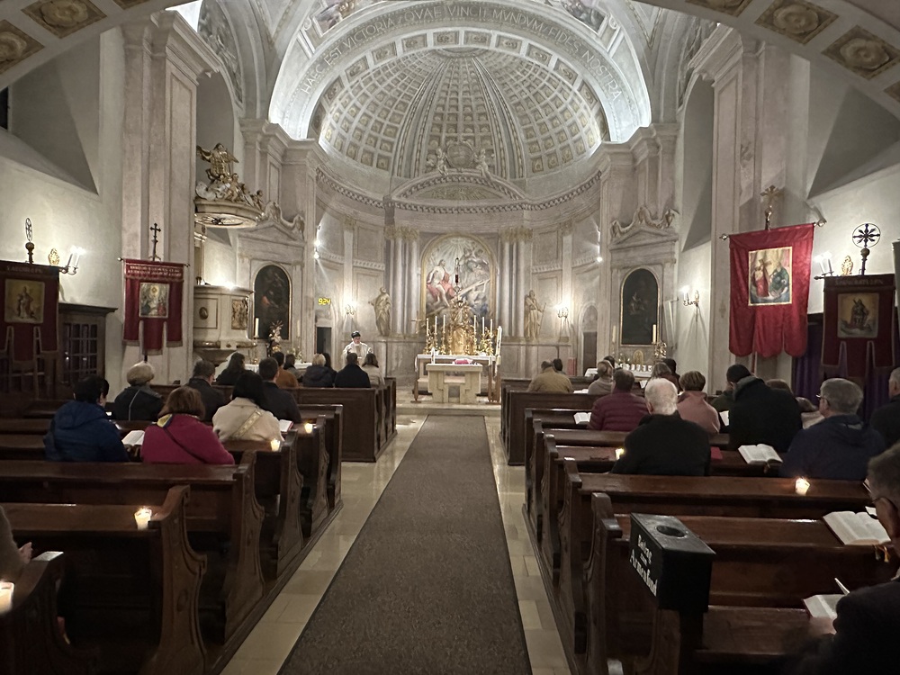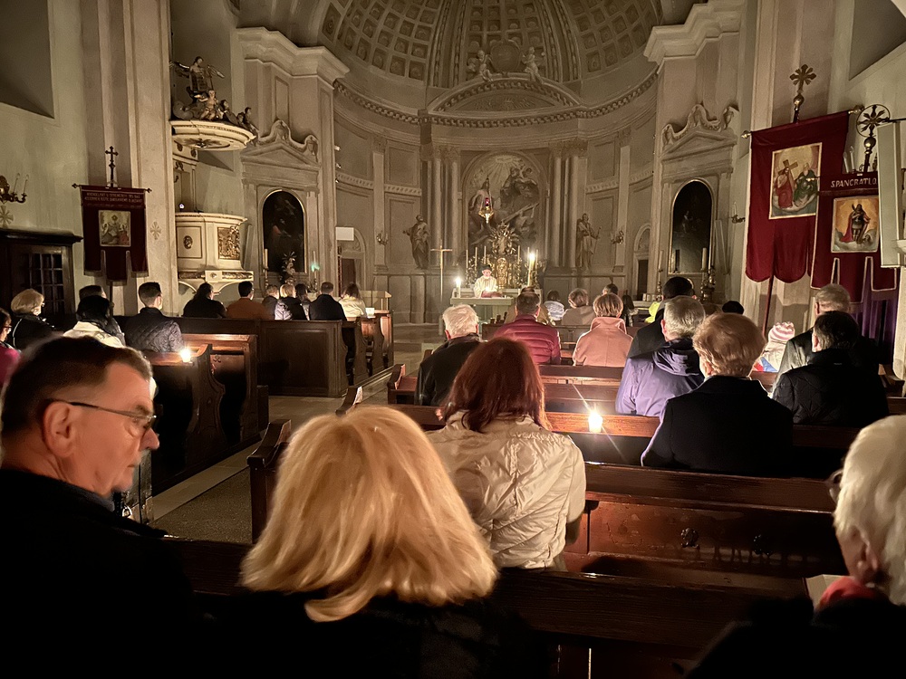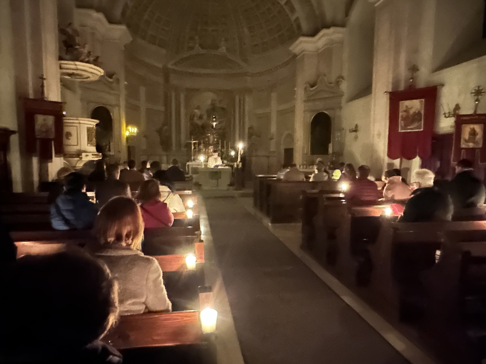 Die Auferstehungsmesse begann um 05:00 Uhr morgens, als es noch dunkel war, im Pfarrhof.