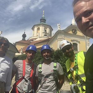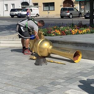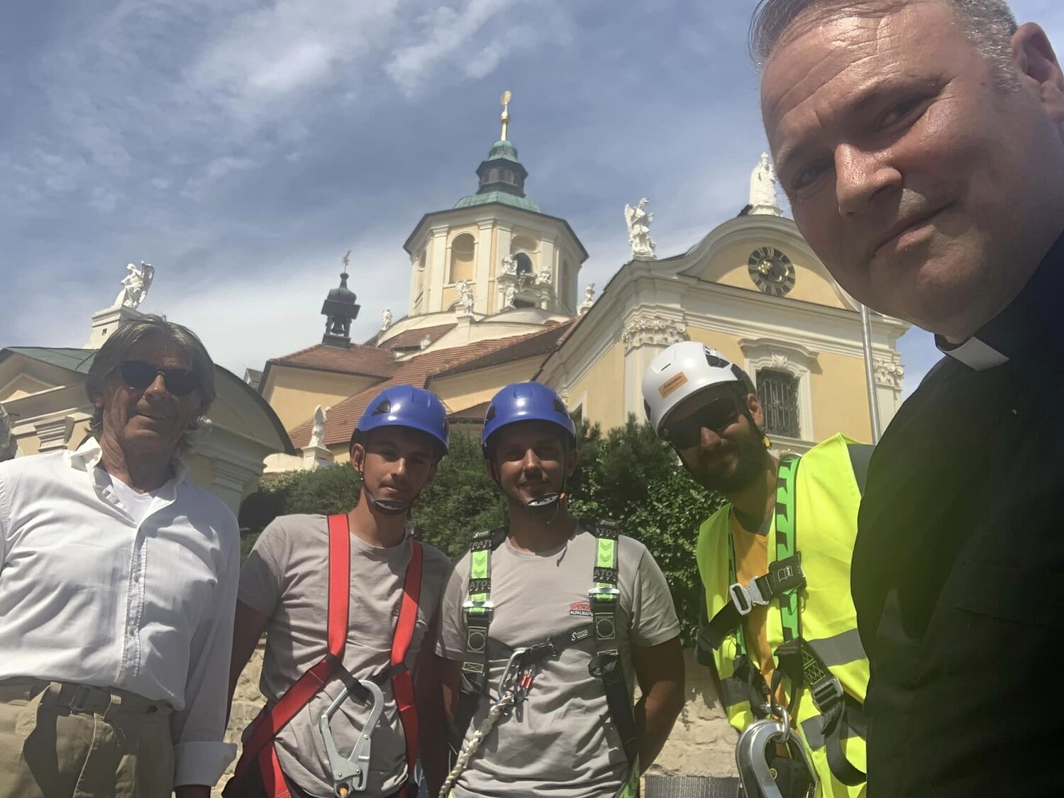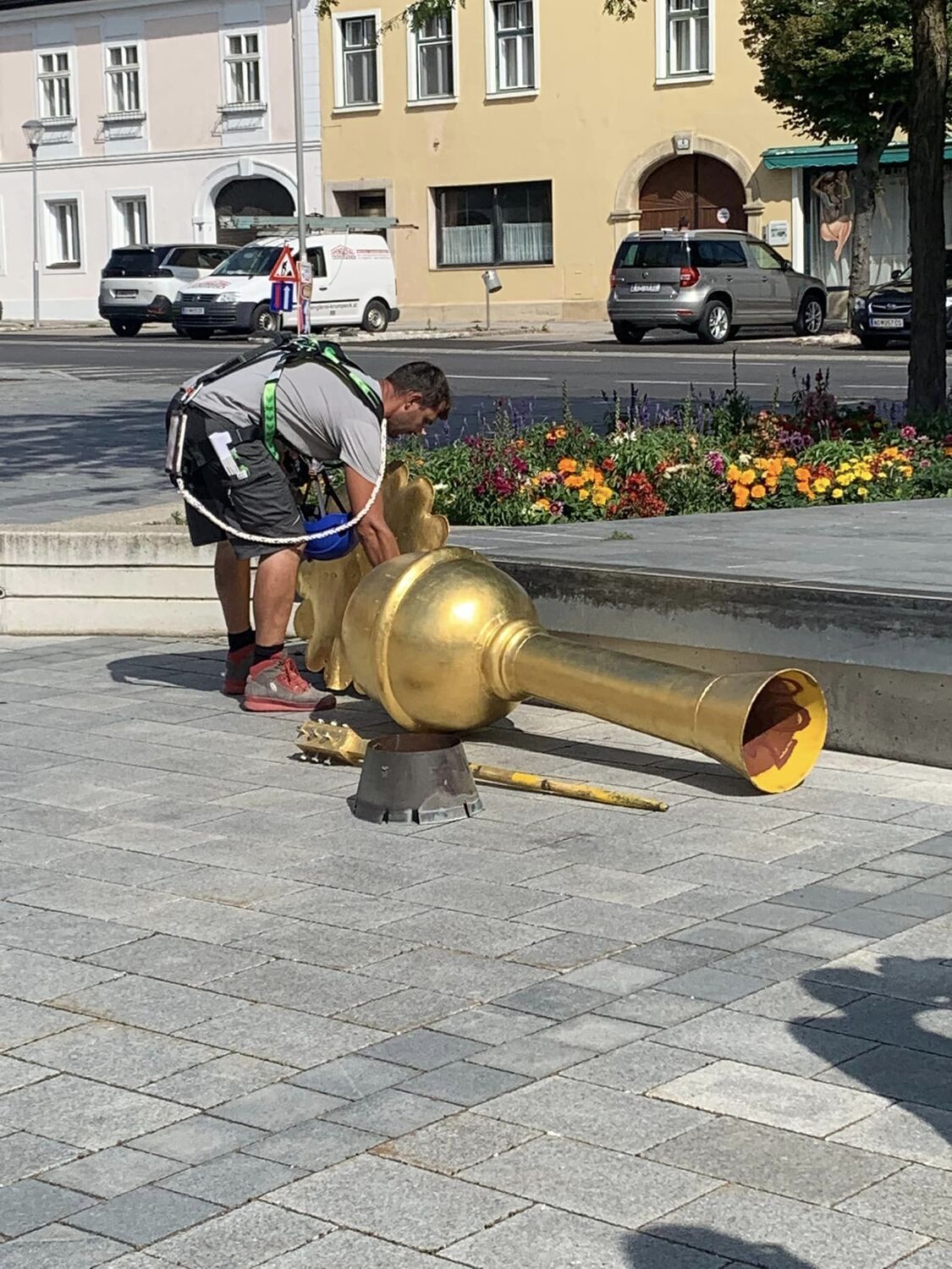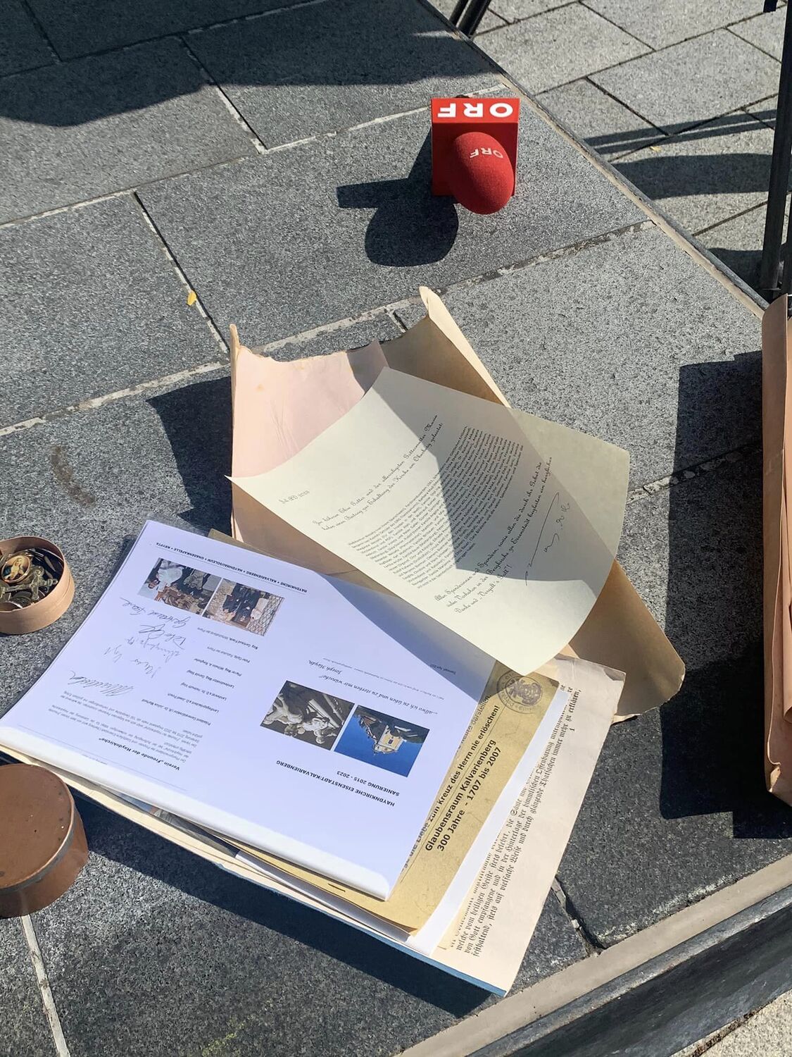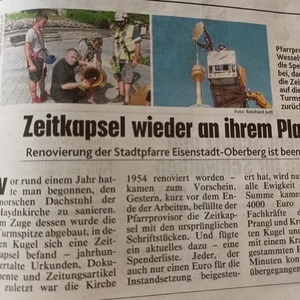 Zeitig in der Früh wurden der Kartusche, welche in der Kugel der Kuppelspitze aufbewahrt wird, die „aktuellen Beilagen“ beigegeben. So finden sich nun neben den Dokumenten aus früheren Zeiten nun auch Dokumente der „Freunde der Bergkirche“, der Wr. Philharmoniker, des Chores und der Spenderinnen und Spender der „Zeitkapsel“ wieder.