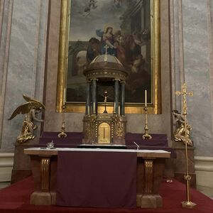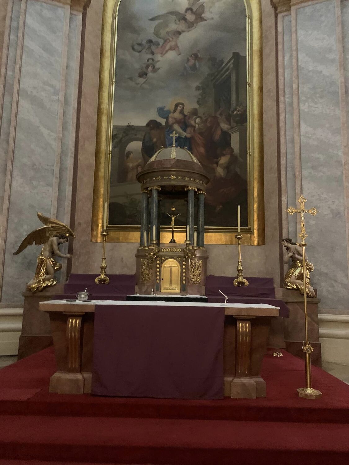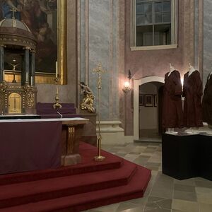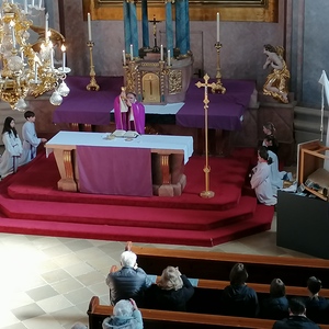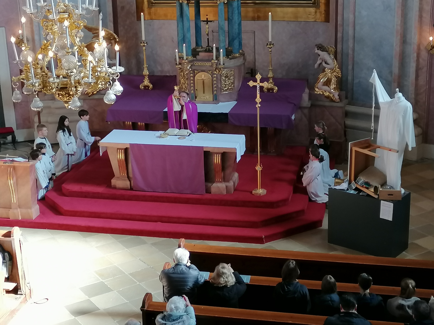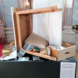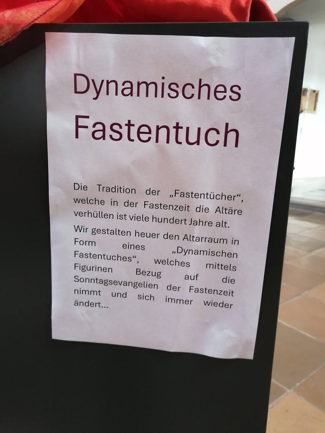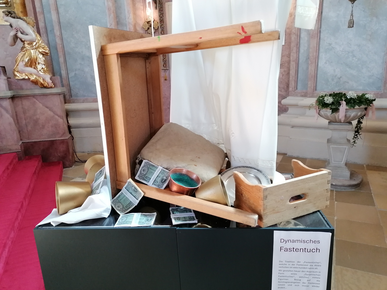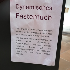 Der Altarraum wird in Form eines "Dynamischen Fastentuches" gestaltet, welches mittels Figurinen Bezug auf die Sonntagsevangelien der Fastenzeit nimmt, sich immer wieder ändert und zur Meditation einlädt.