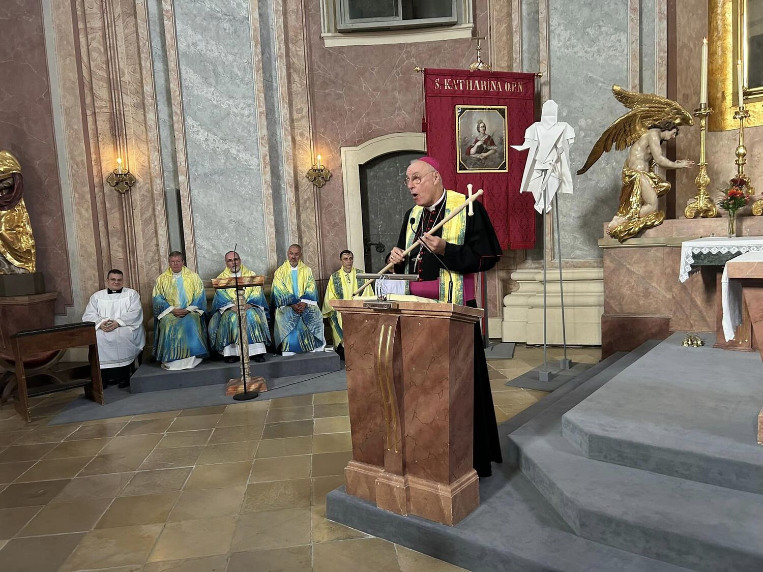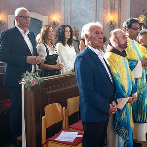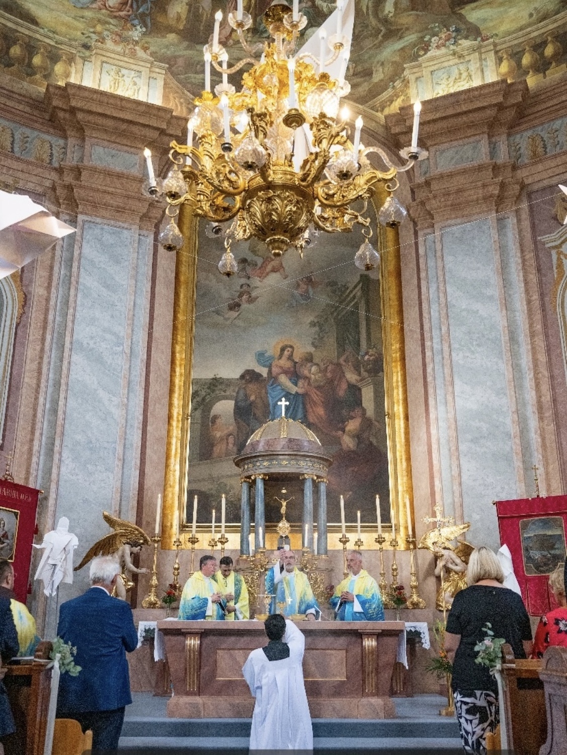 Hauptamtliche Mitarbeiter, sowie die Pfarrgemeinderäte der beiden Pfarren - angeführt durch die beiden Kuratoren Hans Skarits und Kerstin Kosky - übergaben symbolisch die Kirchenschlüssel und brachten Wein und Brot zur Feier der Eucharistie. Zahlreiche Ordensfrauen und -Männer, Priester, der Regens des Wiener Priesterseminars, Redemptoristenpatres, Vertreter der Stadt (Bürgermeister, Vizebürgermeisterin und Amtsleiterin), Mitglieder des "Lazarus-Orden", sowie viele Mitarbeiterinnen und Mitarbeiter der Pfarren waren bei der Feier anwesend; der Chor der Haydnkirche gestaltete musikalisch den Gottesdienst; anschl. wurde von der Pfarre Oberberg zur Agape eingeladen.