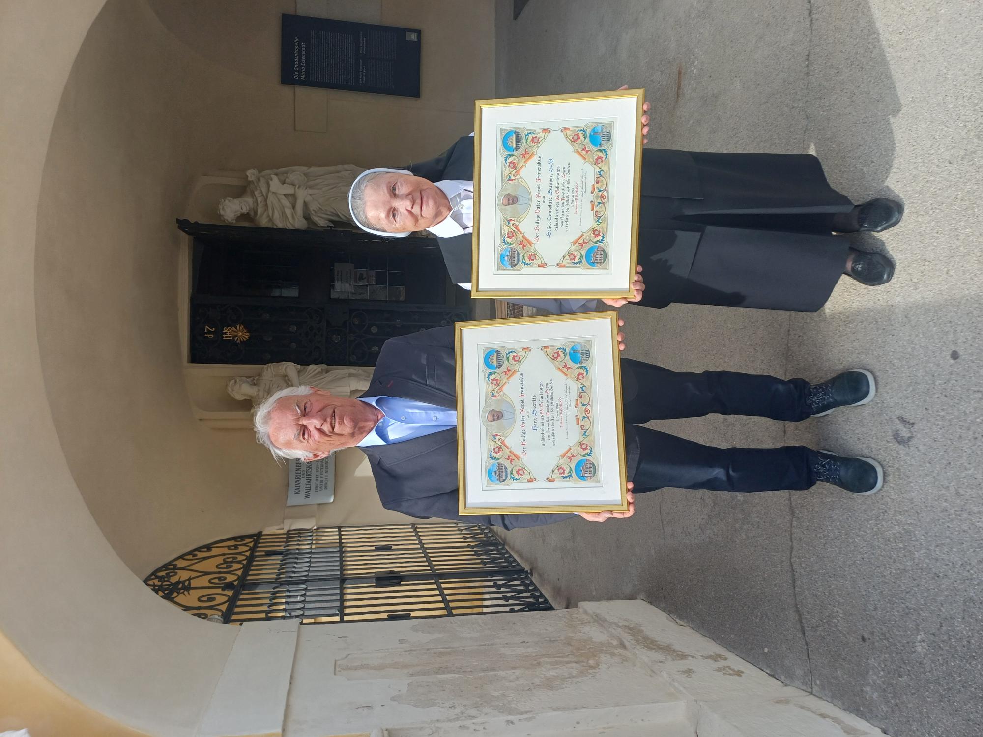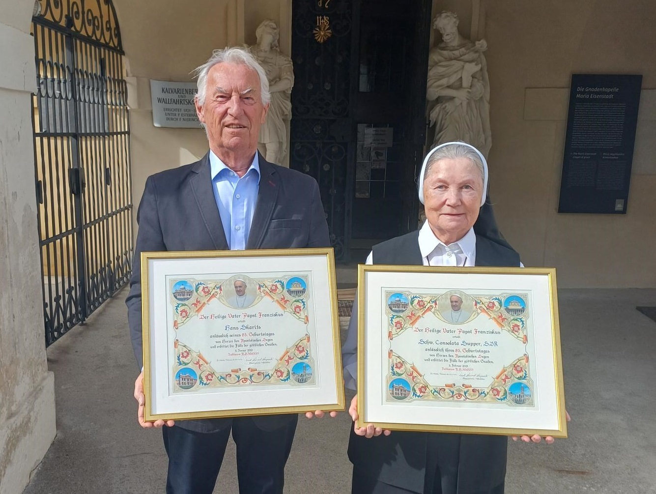 Propstpfarrer P. Lorenz Voith überreichte Kurator Hans Skarits und Sr. Consolata Supper SDR eine päpstliche Segensurkunde. Beide Persönlichkeiten feiern ihren 85. Geburtstag und sind seit Jahrzehnten mit dem Oberberg (der Pfarre und dem Kalvarienberg) verbunden. In einer Feier des Pfarrgemeinderates vor wenigen Wochen wurde für die Tätigkeiten gedankt. Beide Geehrten haben den Oberberg wesentlich mitgeprägt und sind weiterhin im PGR und darüber hinaus aktiv. Danke und Vergelt’s Gott! Die päpstliche Segensurkunde ist ein Zeichen der besonderen Wertschätzung.