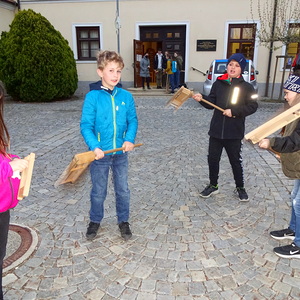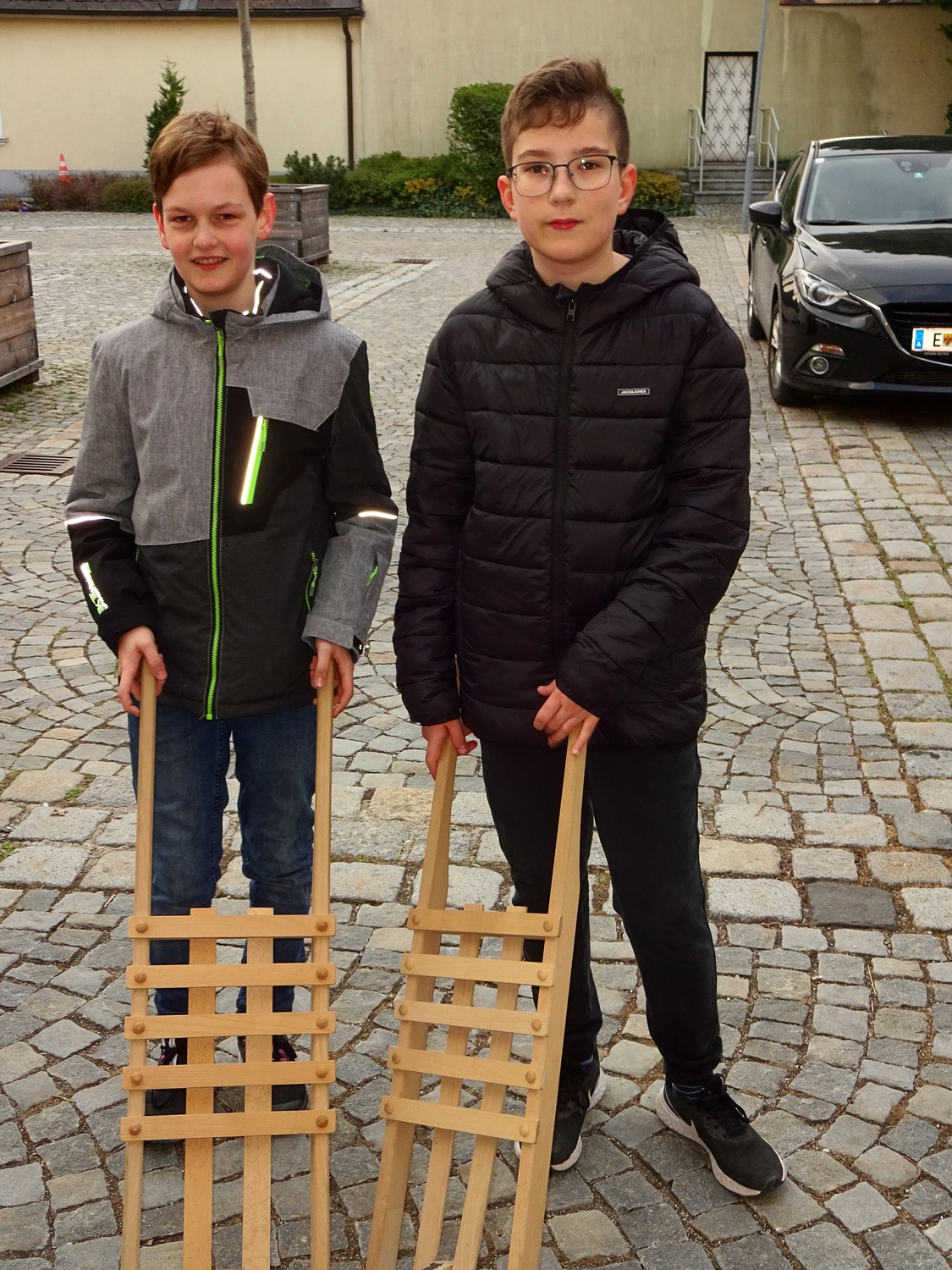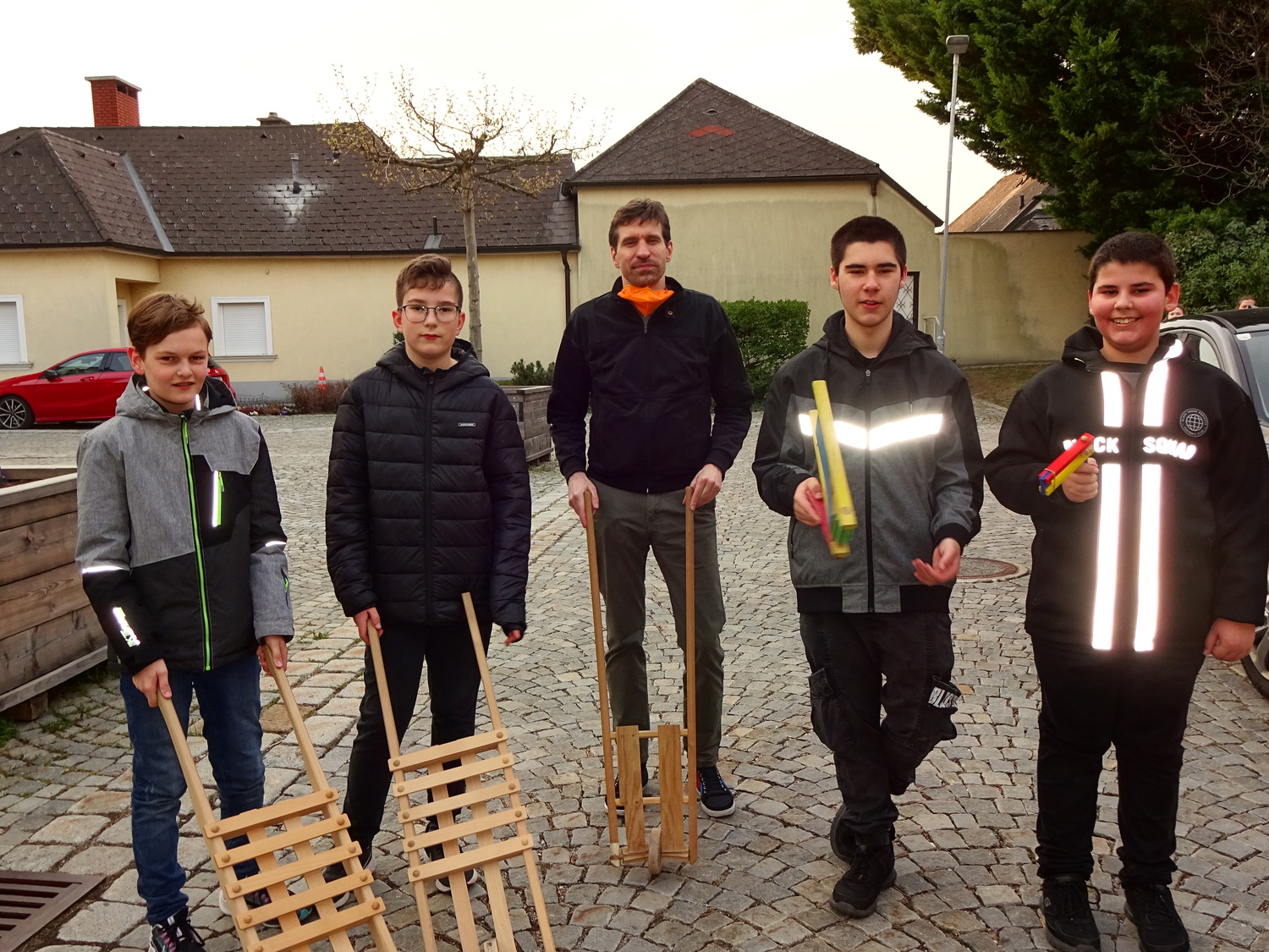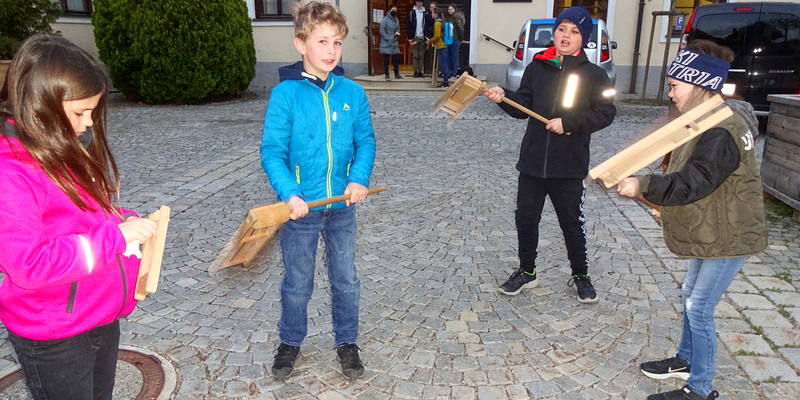 in das Pfarrheim und machten sich mit ihren Ratschen