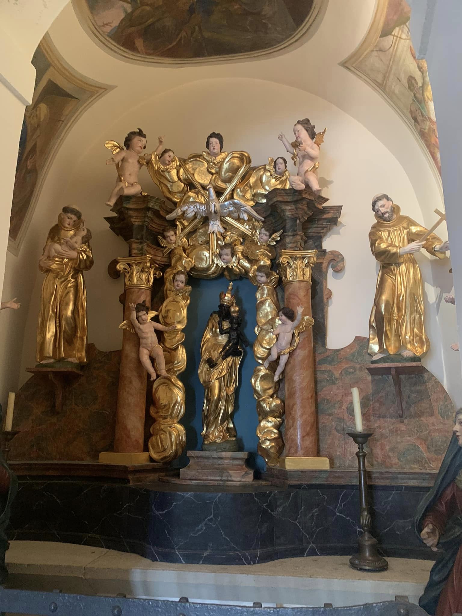 Zunächst muss man die Frage beantworten, ob immer schon ein Loretto-Altar war und das verrät uns die Kunsttopographie, dass dies nicht so ist, vielmehr war ein MarienBILD an jenem Platz, wo heute die MarienSTATUE aufgestellt ist. Und auch die Assistenzfiguren dürften einmal wo anders aufgestellt gewesen sein, zumindest hat man für den Hl. Franziskus und den Hl. Antonius neue Postamente gebraucht und diese - Blumenbords gleich - schnell aus Holz gefertigt. Durch die geschickte Bemalung und die gelungene Anordnung des Altares bei der Neuaufstellung fällt dies erst auf den zweiten - und genauen Blick - auf.