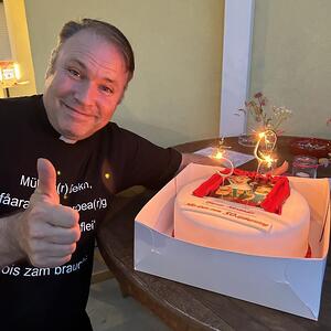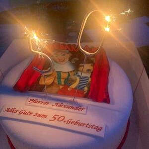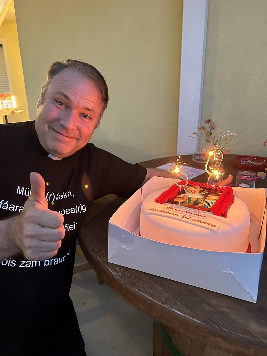 Man gratuliert zwar nicht im vorhin, aber bei einem besonderen Geburtstag fängt man früher an und hört später auf. Deshalb nutzten wir diesen herrlichen Rahmen des Pfarrfestes, um unserem Pfarrmoderator Alexander Wessely zu seinem anstehenden 50. Geburtstag zu gratulieren (ah „30.“ wie er sagt ;-))