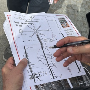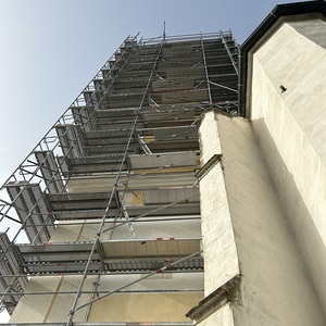 Aktuell ist alles im Zeitplan. Die Gerüstbauer haben bereits 13 Etagen geschafft und werden voraussichtlich morgen mit dem größten Teil fertig. Die Eingerüstung des Spitzes erfolgt dann zeitgleich mit der Einnetzung des unteren Teils. Voraussichtlich kann nächste Woche schon mit dem Sandstrahlen begonnen werden.