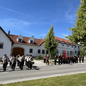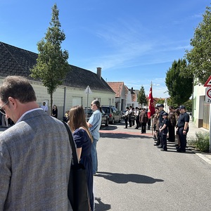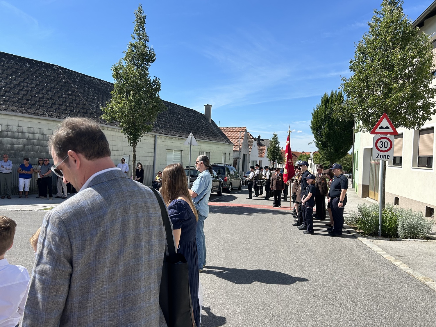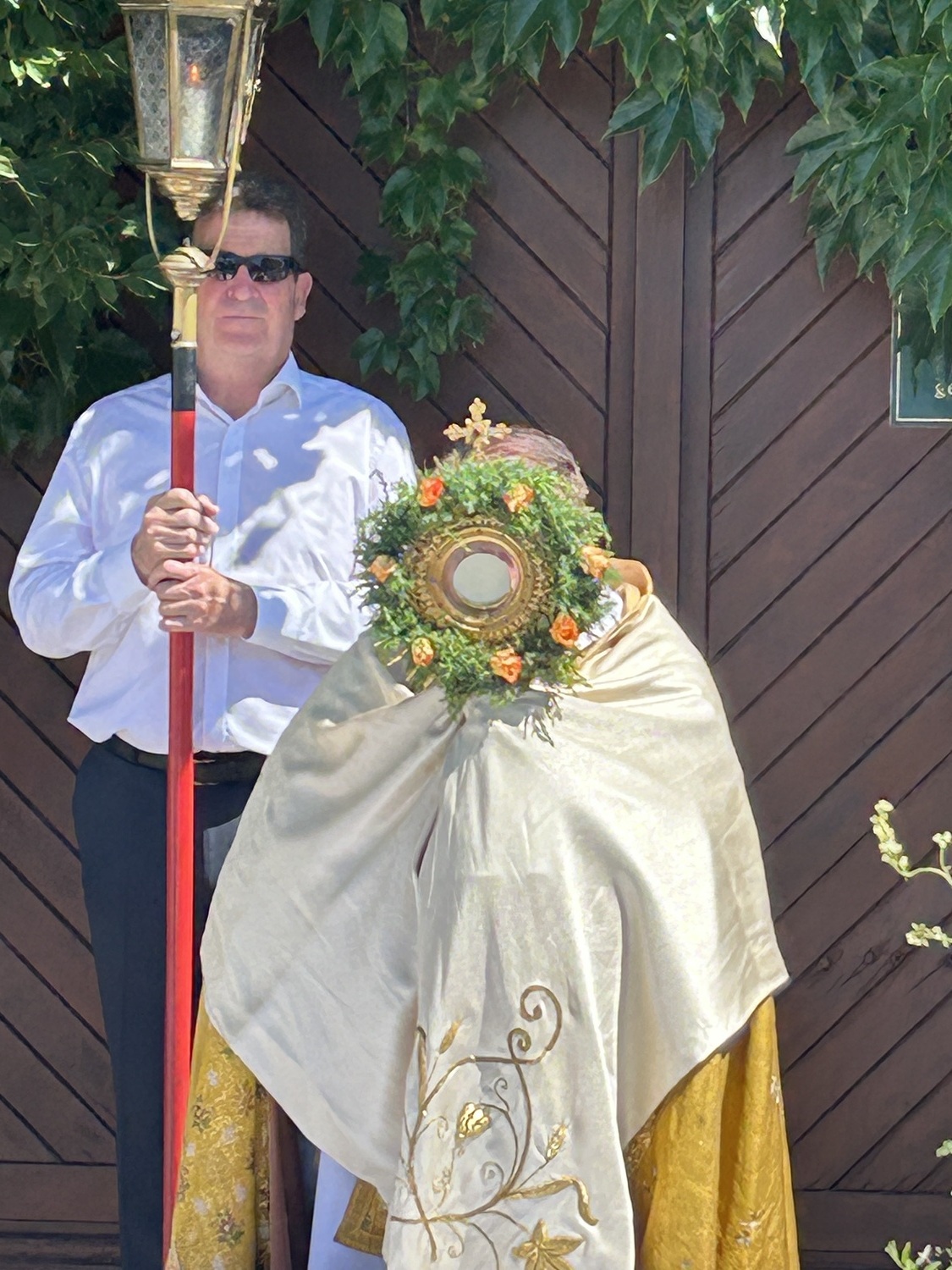Schließlich gehen wir noch mit unserer Prozession am Haus eines Kameraden unseres Pfarrers vorbei, seine Frau sieht nicht mehr gut, ihm ist es gesundheitlich auch schon einmal besser gegangen. Seine Frau kommt vor die Türe. Wir halten an und auch hier wird der Segen gespendet.