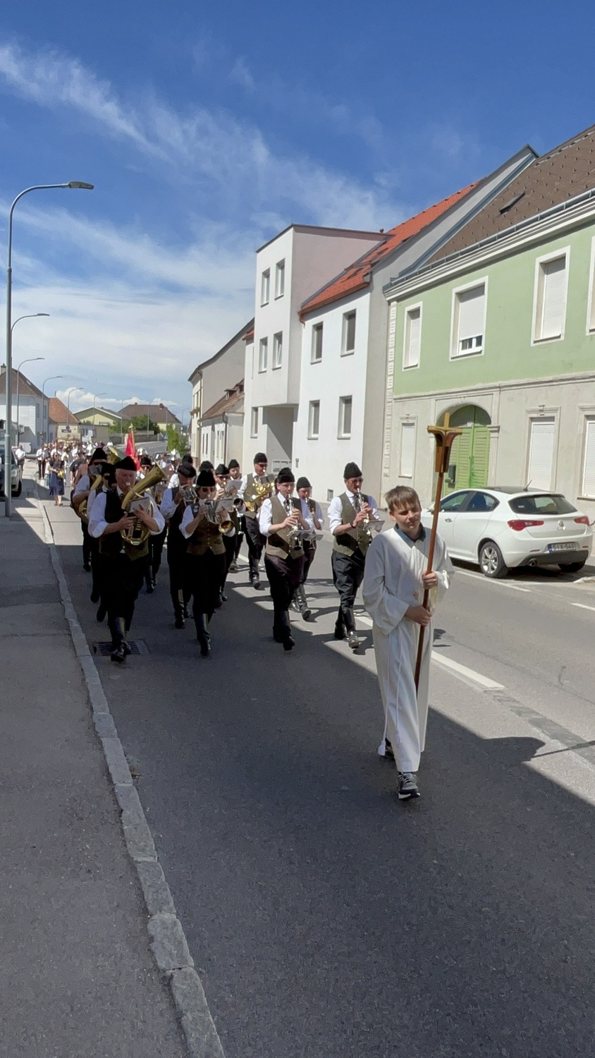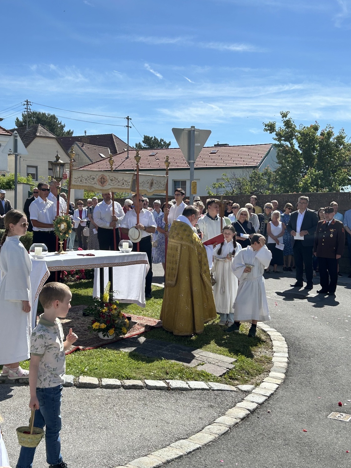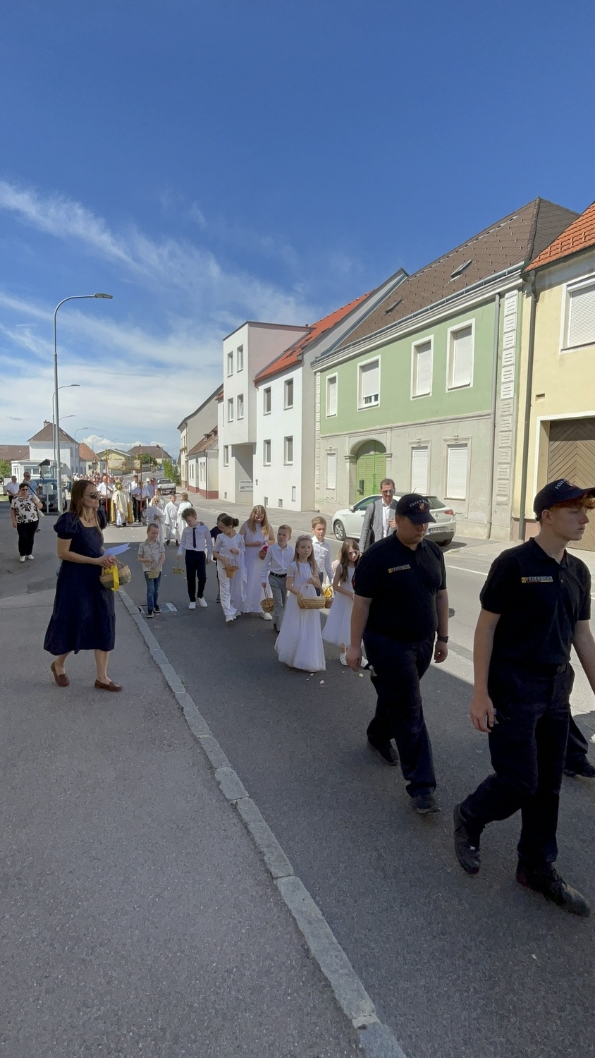 Heute waren wieder die Häuser, Straßen und Plätze im Dorf in der Stadt geschmückt. Nach der Hl. Messe in der Pfarrkirche wurde die Prozession zu den 4 Altären im Dorf von der Winzerkapelle Kleinhöflein, der Freiwilligen Feuerwehr, den Sänger:innen , den Erstkommunionskindern von Kleinhöflein, sowie zahlreichen Kindern und Gläubigen begleitet. Alles zur Ehre Gottes, den wir in Form der Hostie durch unser Dorf trugen.