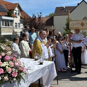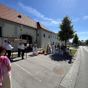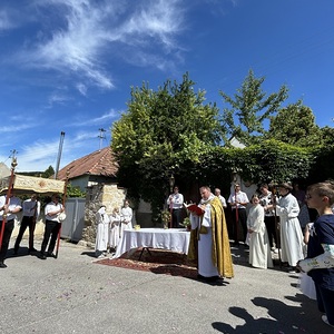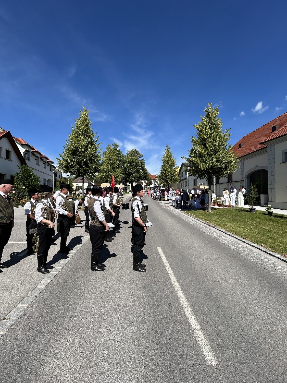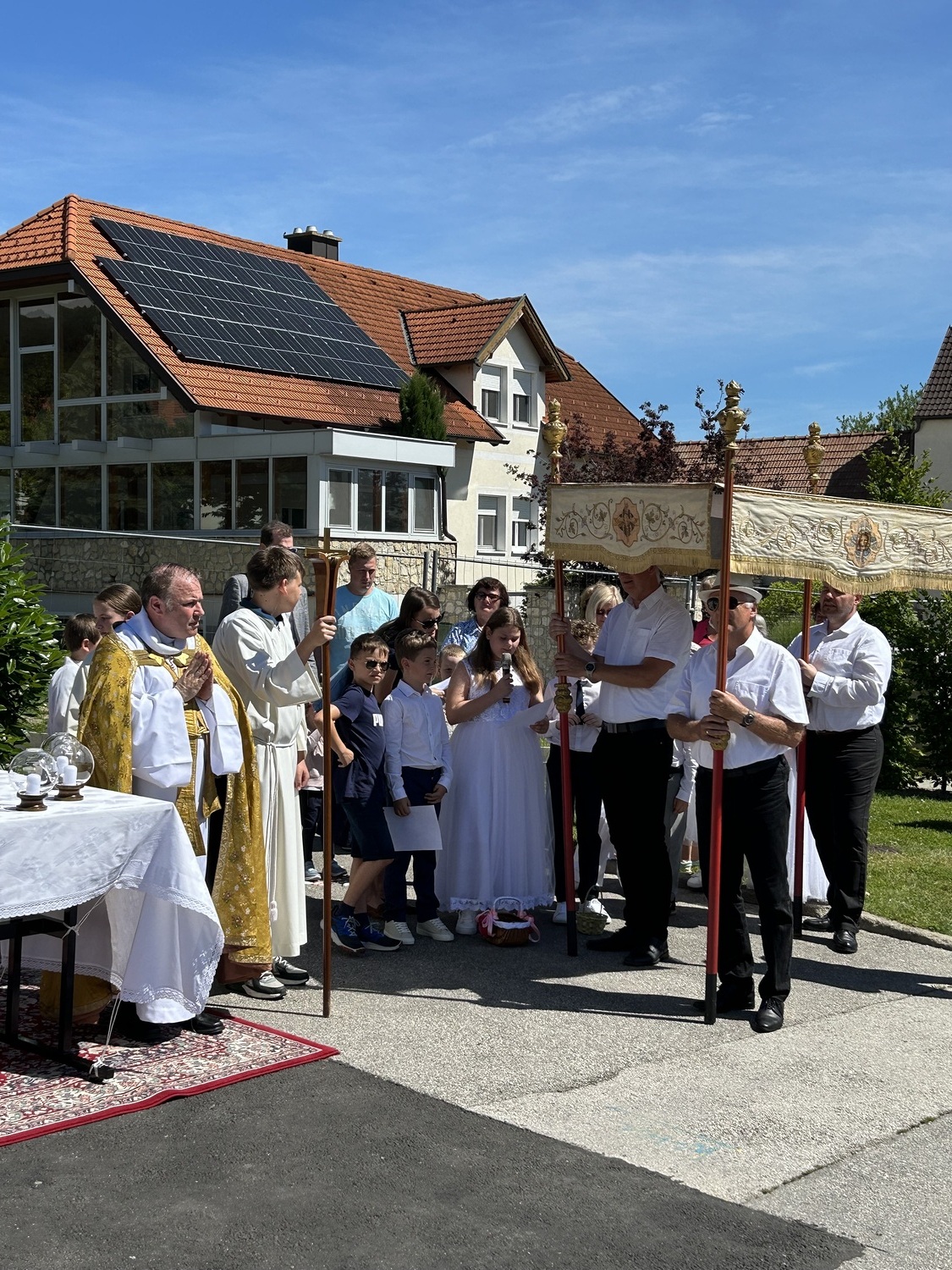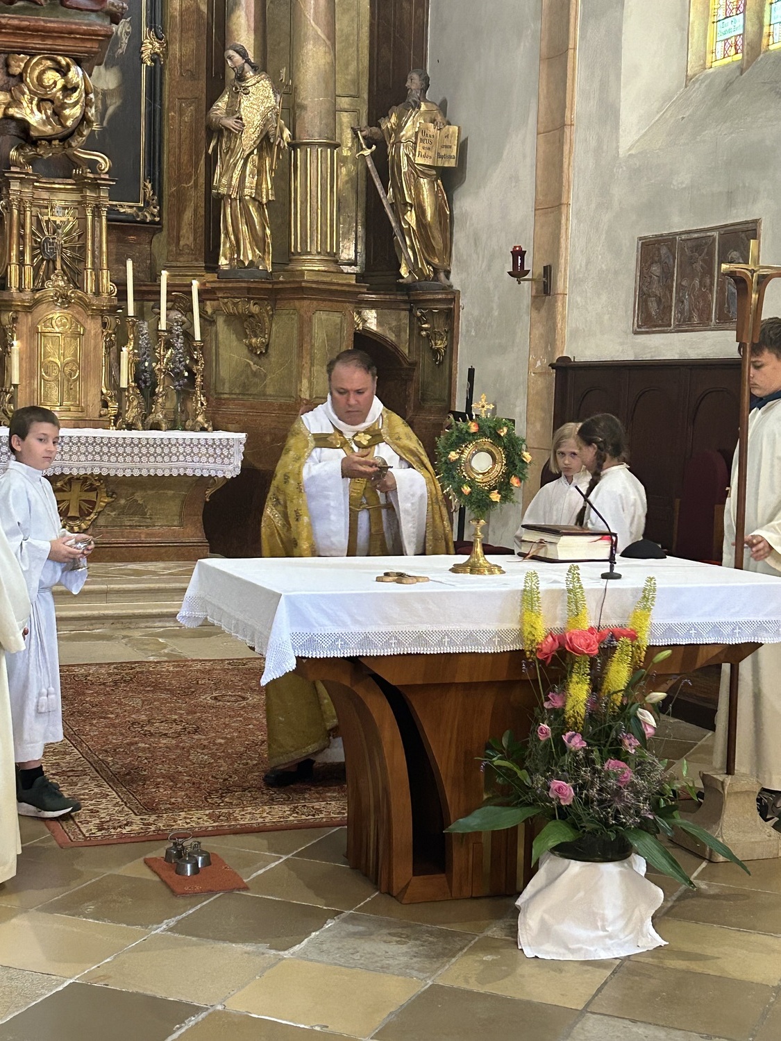 Heute waren wieder die Häuser, Straßen und Plätze im Dorf in der Stadt geschmückt. Nach der Hl. Messe in der Pfarrkirche wurde die Prozession zu den 4 Altären im Dorf von der Winzerkapelle Kleinhöflein, der Freiwilligen Feuerwehr, den Sänger:innen , den Erstkommunionskindern von Kleinhöflein, sowie zahlreichen Kindern und Gläubigen begleitet. Alles zur Ehre Gottes, den wir in Form der Hostie durch unser Dorf trugen.