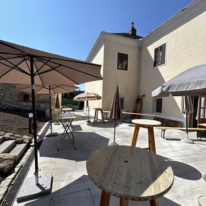 Die Stehtische und Sonnenschirme stehen bereit und die Getränke sind schon eingekühlt.