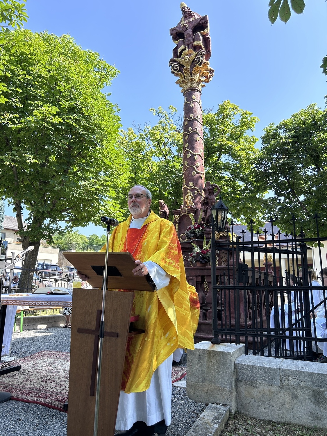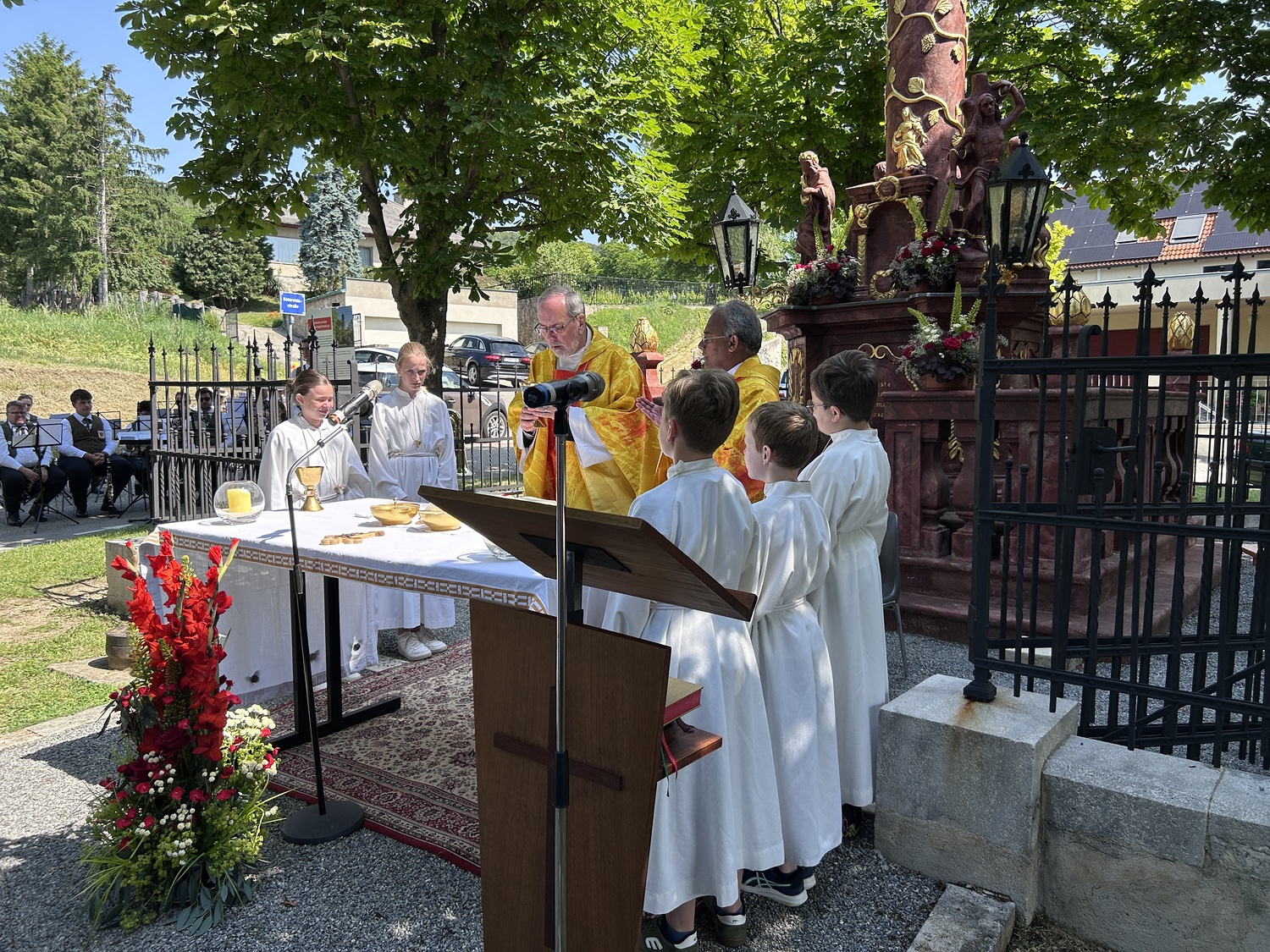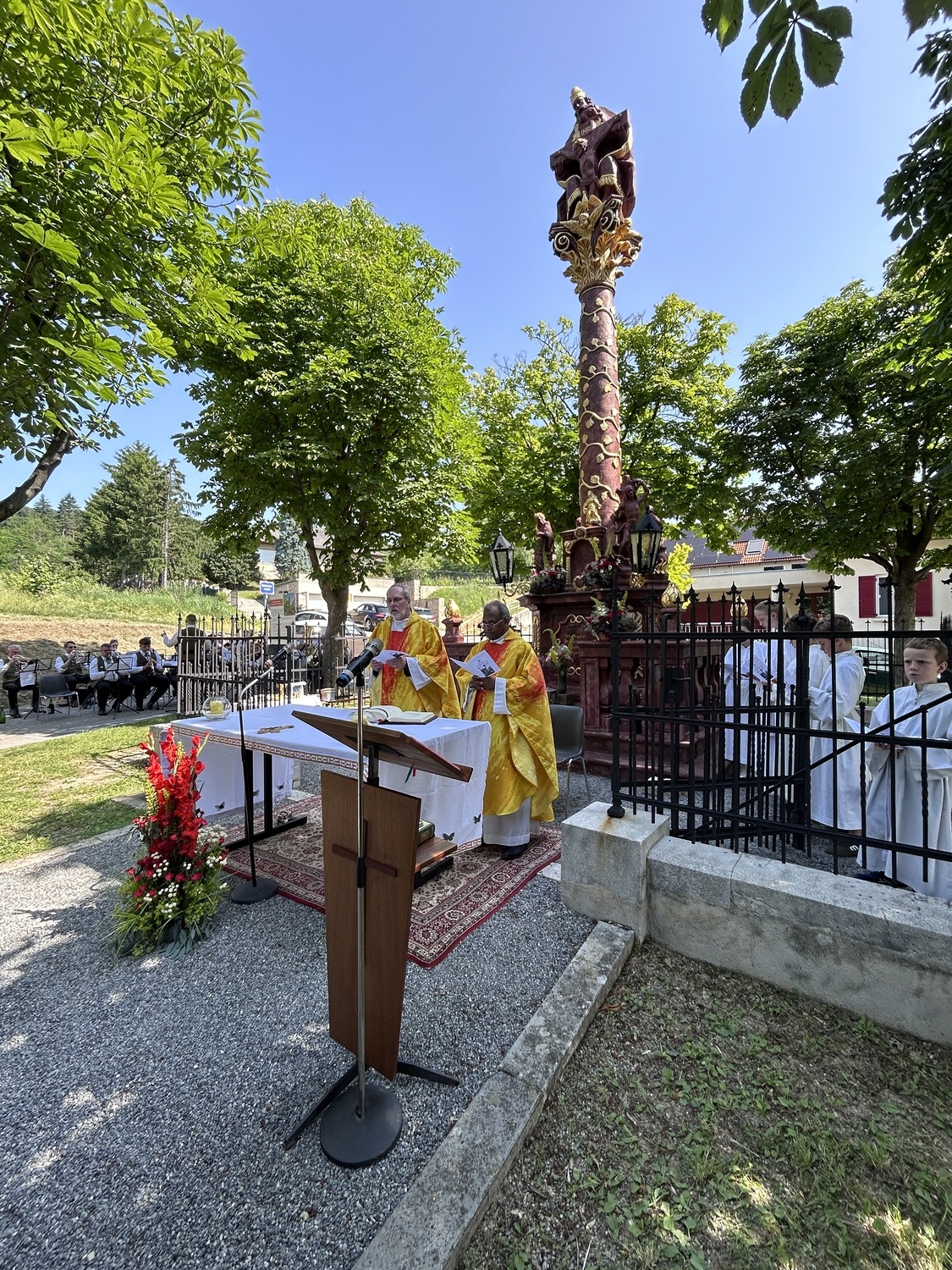 Bei strahlendem Wetter feierten wir heute im Pfarrverband eine besonders festliche hl. Messe im Freien – vor der eindrucksvollen Kulisse unserer Dreifaltigkeitssäule.