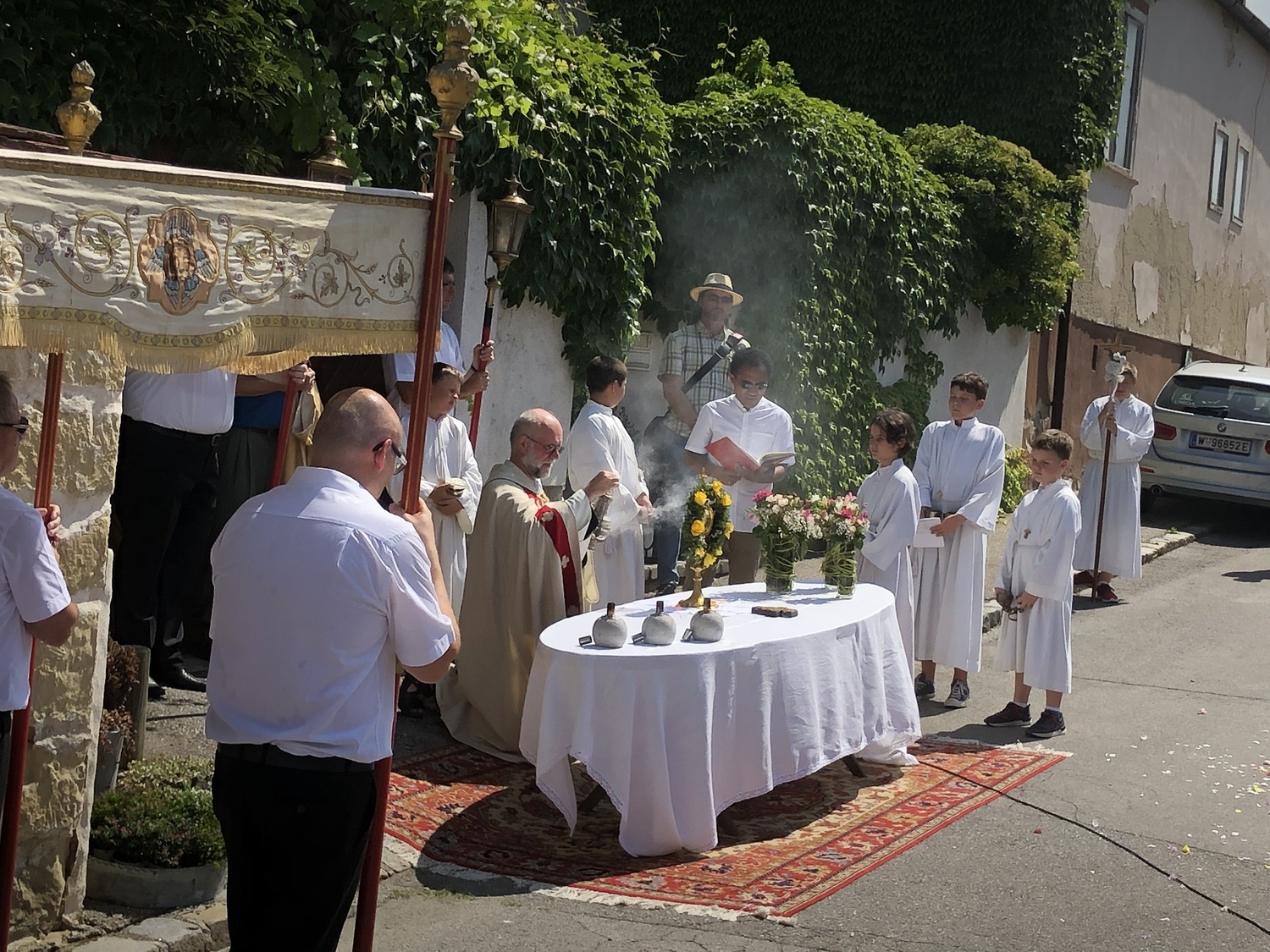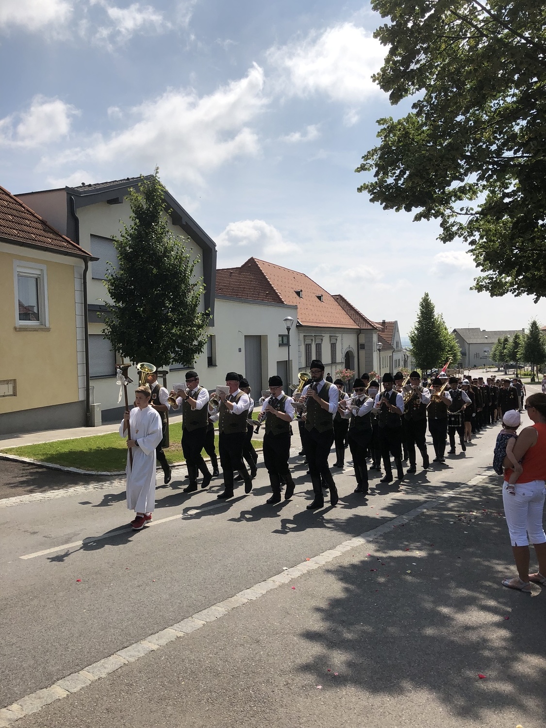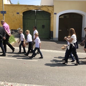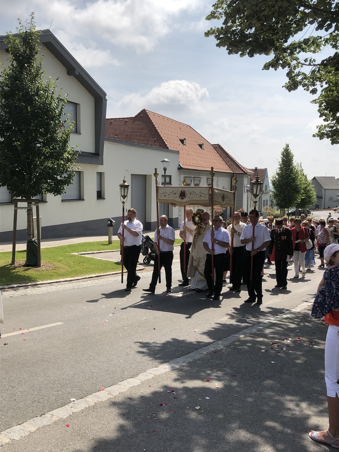 Zu Fronleichnam bezeugen wir unseren Glauben and die leibliche Gegenwart Jesu Christi im Saktrement der Eucharistie. Der Name des Festes leitet sich aus dem Mittelhochdeutschen "vrone licham" - Leib des Herren ab. Das Brauchtum der Fromleichnamsprozession, bei der der Leib Christi in einer Monstranz durch die Straßen getragen wird, stammt aus dem Mittelalter. Dabei werden auch der Flurschutz, Feldweihen und Wetterbitten dargebracht. Bei der Prozession nahmen traditionell Feuerwehr und Musikverein, sowie die Erstkommunionskinder und viele Gläubige teil.