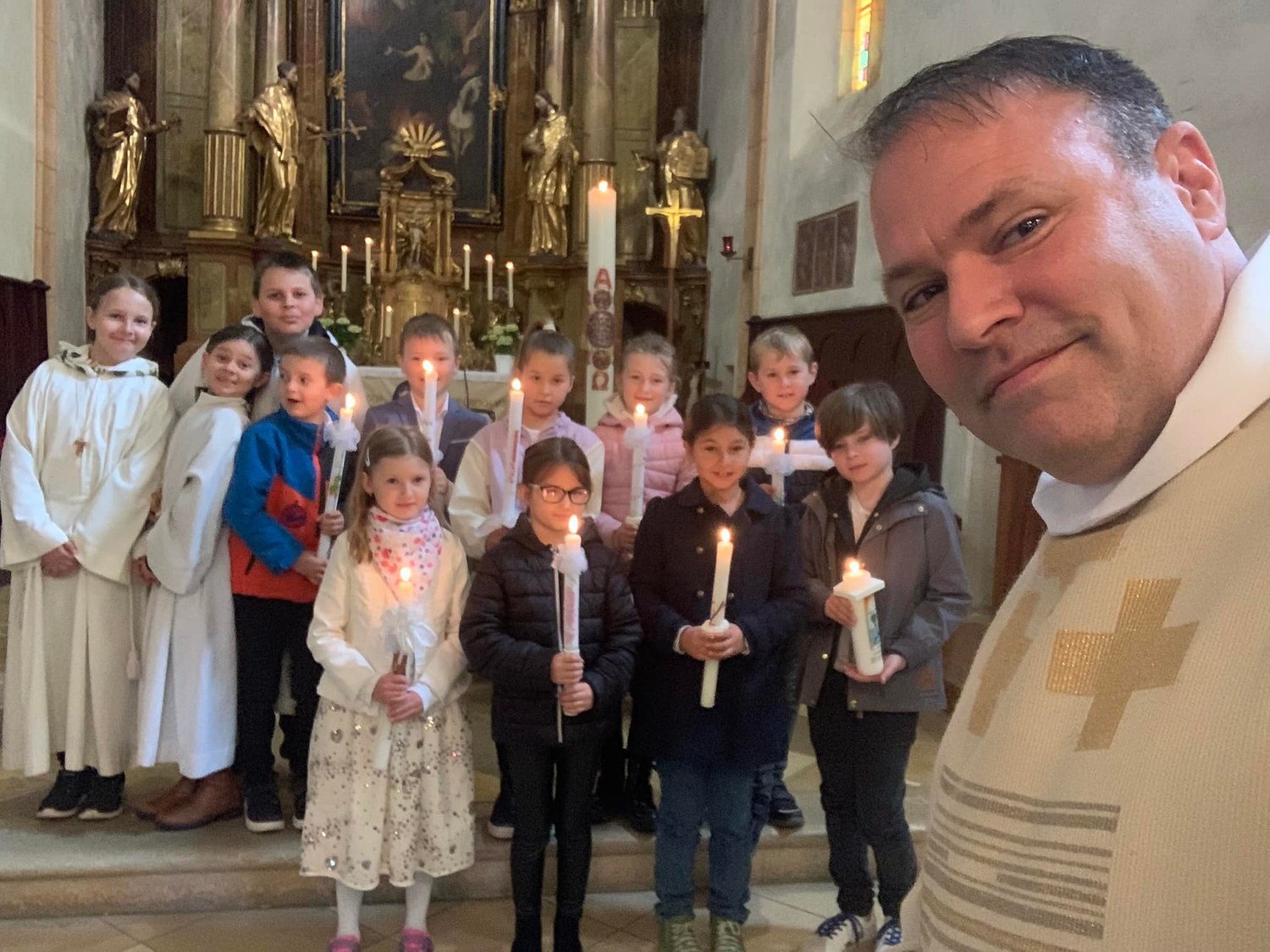 Am Weißen Sonntag bzw. seit Papst Johannes Paul II auch Barmherzigkeitssonntag genannt, fand die Tauferneuerung unserer Erstkommunionskinder statt. Mit großer Begeisterung gestalteten sie den Gottesdienst gemeinsam mit den Tischeltern und Pastoralassistent Fred mit. Pfarrer Alexander erzählte von der heiligen Faustyna Kowalska, nach welcher der Barmherzigkeitssonntag genannt wurde. Sie beschrieb nach einer Erscheinung den Barmherzigen Jesu mit weißem Gewand und 2 großen Strahlen, welche aus seinem geöffneten Herzen kamen und mit der Unterschrift: Jesu, ich vertraue auf dich.