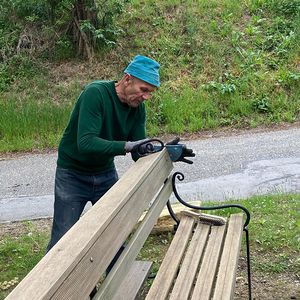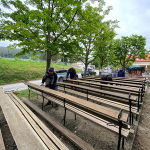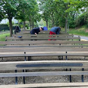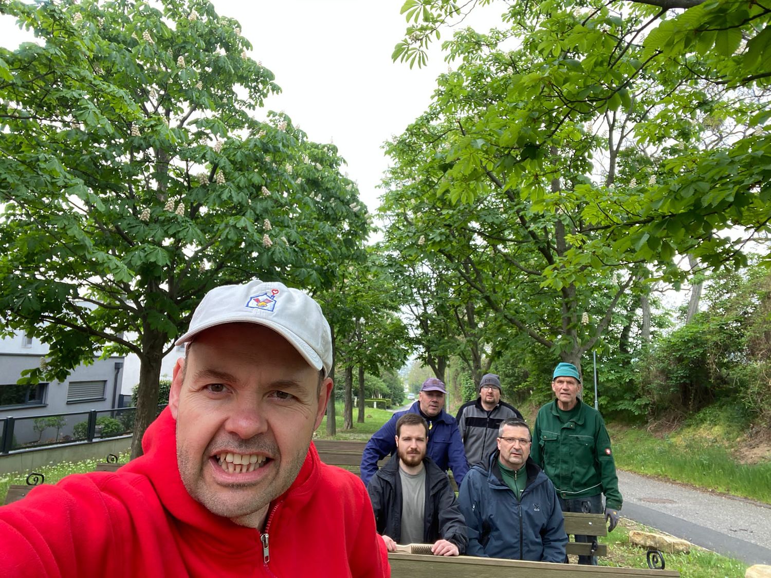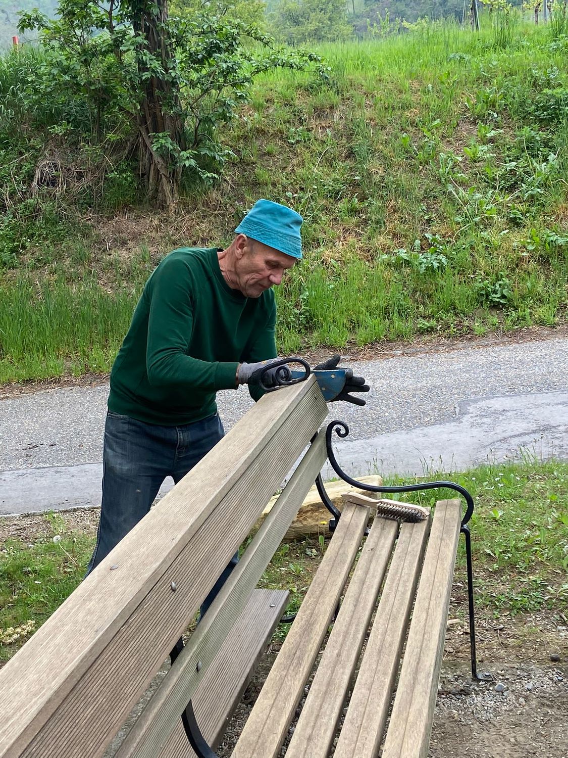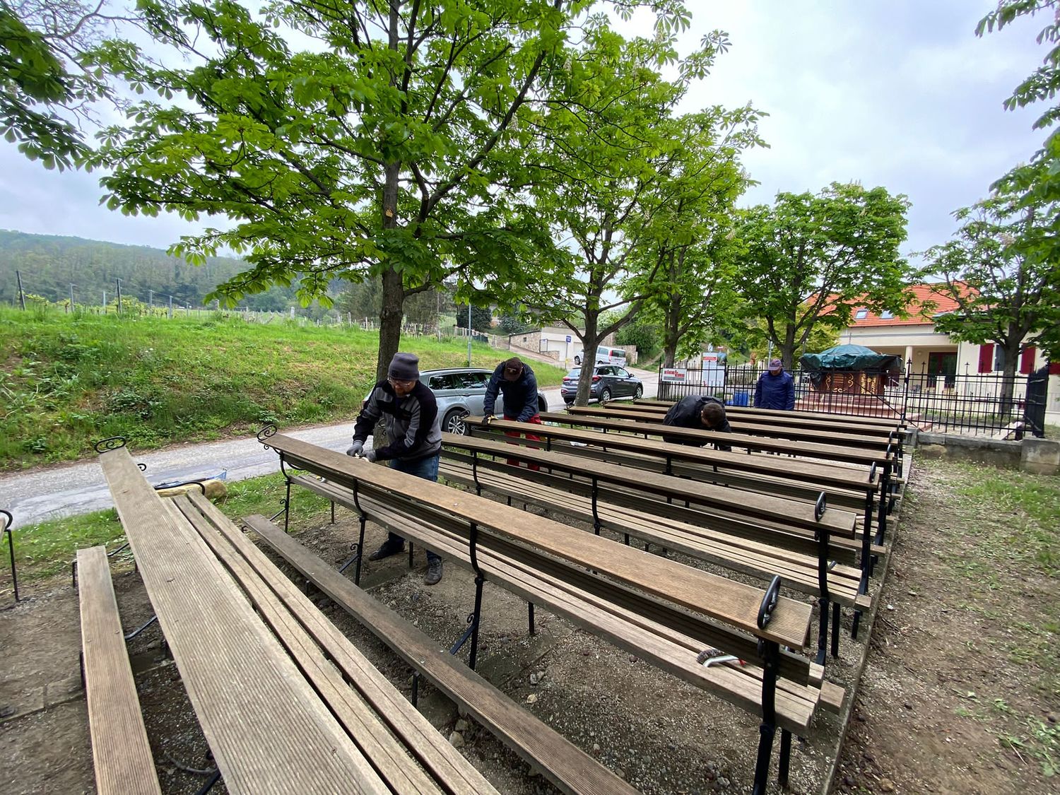 Im Zuge der Sanierung werden seitens der Pfarre auch die Sitzbänke in Eigenregie renoviert. Am Samstag, 7.5.2022 trafen sich einige Pfarrmitglieder um die verwitterten Sitzgelegenheiten rund um die Säule wieder auf Vordermann zu bringen.  Diese werden abgeschliffen, grundiert und neu eingelassen, damit auch sie bei der Segnung am 12. Juni 2022 wieder in neuem Glanz erstrahlen und zum Verweilen einladen.