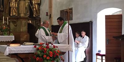 Kleinhöflein - Im Rahmen des Gottesdienstes gratulierte Pfarrer Ringhofer Pfarrer Mathias Reiner zu seinem Jubiläum.