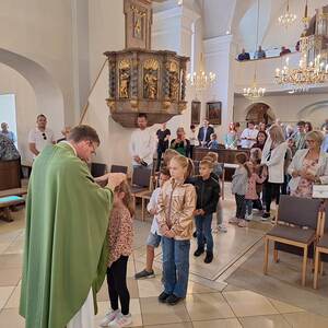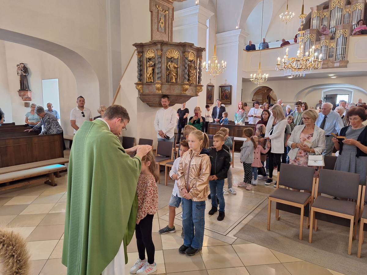 Nach der hl. Messe am Sonntag, 1.10.2023, segnete Pfarrmoderator Mag. Stefan Jahns die Kinder. Mit der Kindersegnung sollen die Jüngsten unter den Schutz Gottes in unserer Pfarre gestellt werden, die Schutzengel sollen die Kinder begleiten.