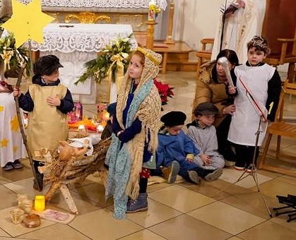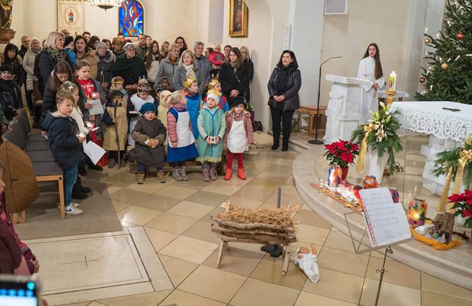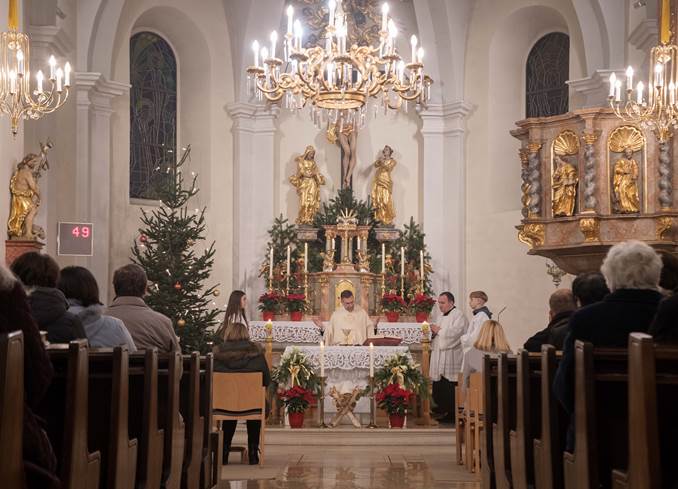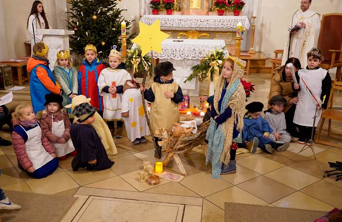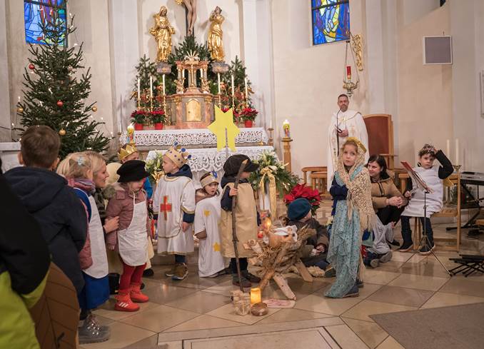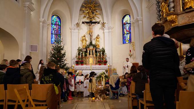 Mit der Krippenandacht mit und für Kinder begann am 24.12.2023 der heilige Abend, der über die familiäre Feier zu Hause und in die nächtliche Feier der Christmette führte. Das Krippenspiel wurde von der Jungschar und den Kindergarten-Kindern gestaltet.