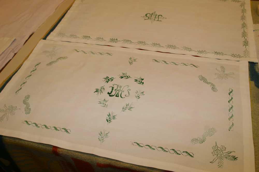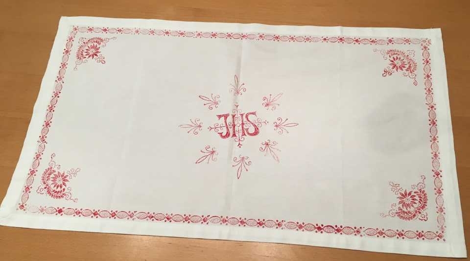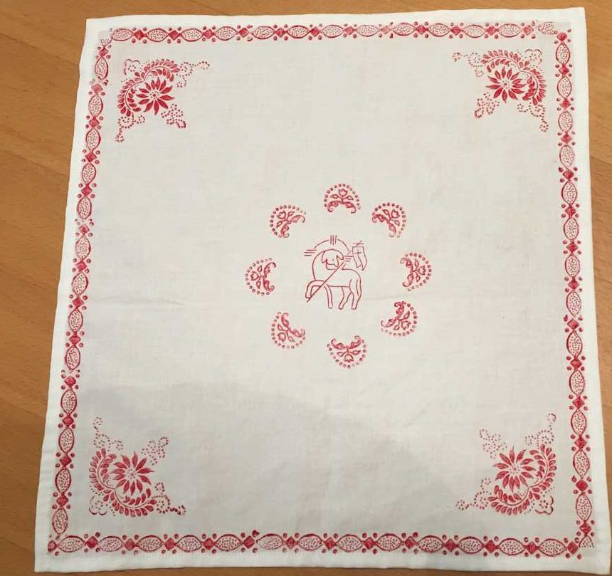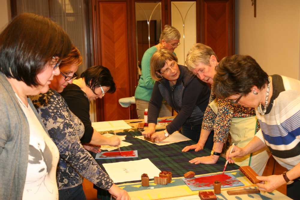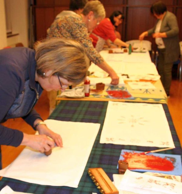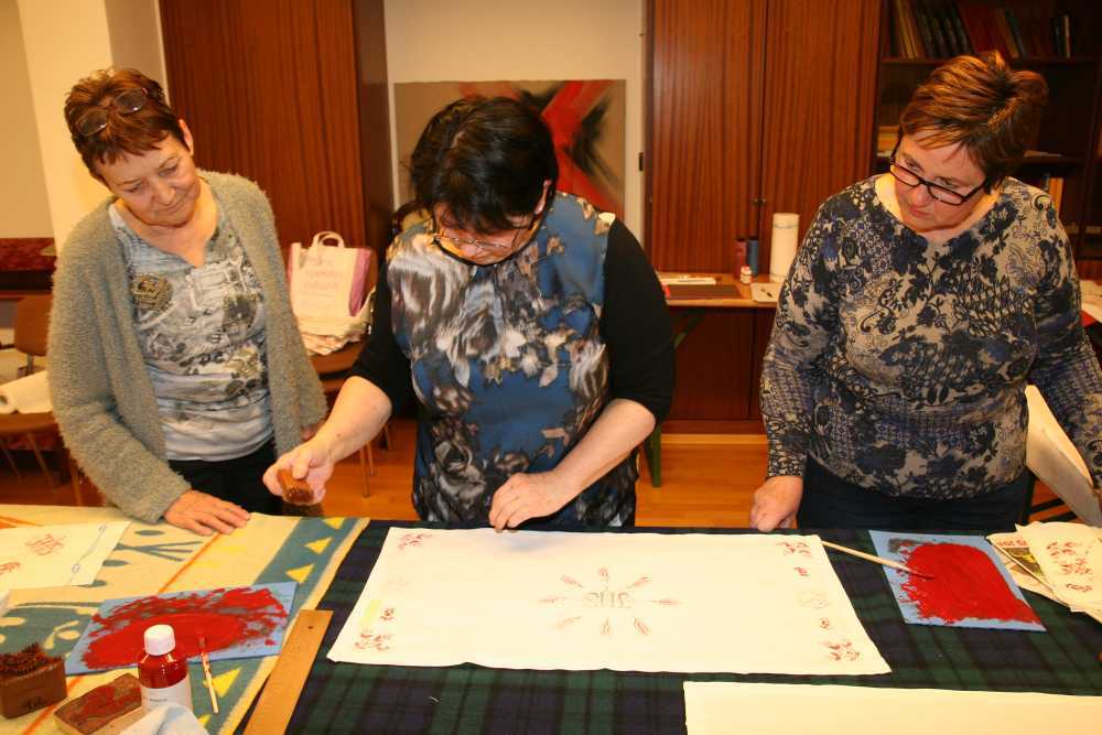 Danach gestalten die Frauen mit Hertha Decker ein Stoffdruckdeckerl. Es entstanden mit viel Freude und Einsatz Weihedeckerl für die Segnung der Osterspeisen aber auch individuell gestaltete Stoffdruckdeckerl.